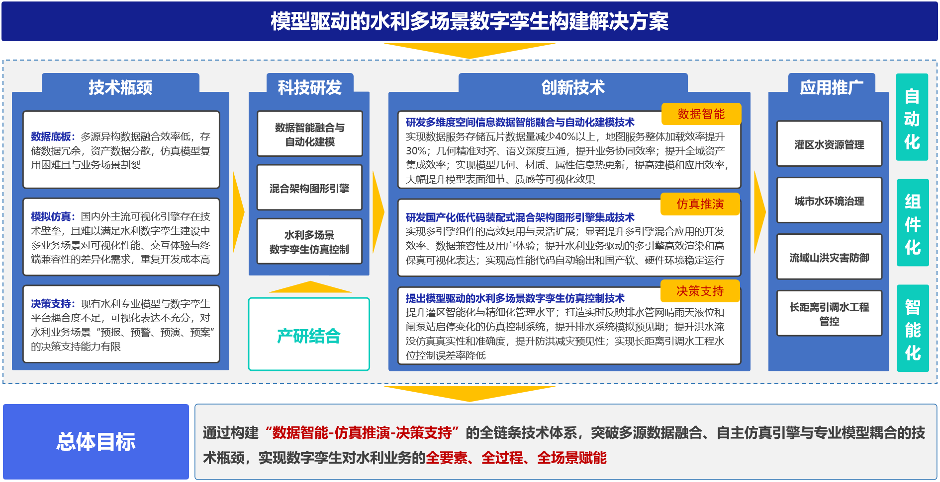 “模型驱动的水利多场景数字孪生构建解决方案”是长江信达公司响应水利部“智慧水利”建设与数字孪生流域战略部署的重要创新成果。围绕水利现代化治理与精准决策需求,以系统性思维突破水利数字化转型瓶颈,重点构建覆盖防洪调度、水资源管理、工程运维等多业务场景的孪生应用体系,强化水文、气象、地理等多源数据协同,通过多源数据融合、机理-数据双驱动建模、虚实交互验证等核心技术,实现全要素数字化映射、全流程智能化模拟、全场景交互式推演,攻克了传统水利模型与数字平台耦合度低、跨业务仿真适配性弱等难题,为流域“四预”功能提供高精度决策支持,赋能新时代水利高质量发展。