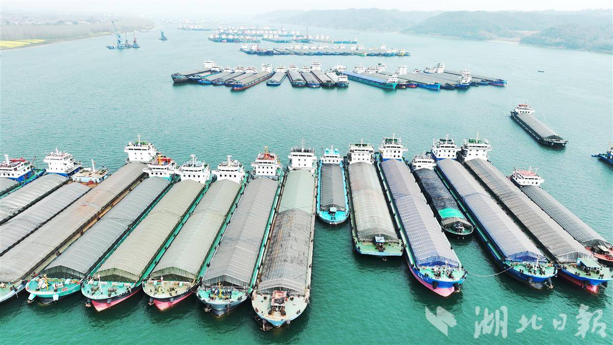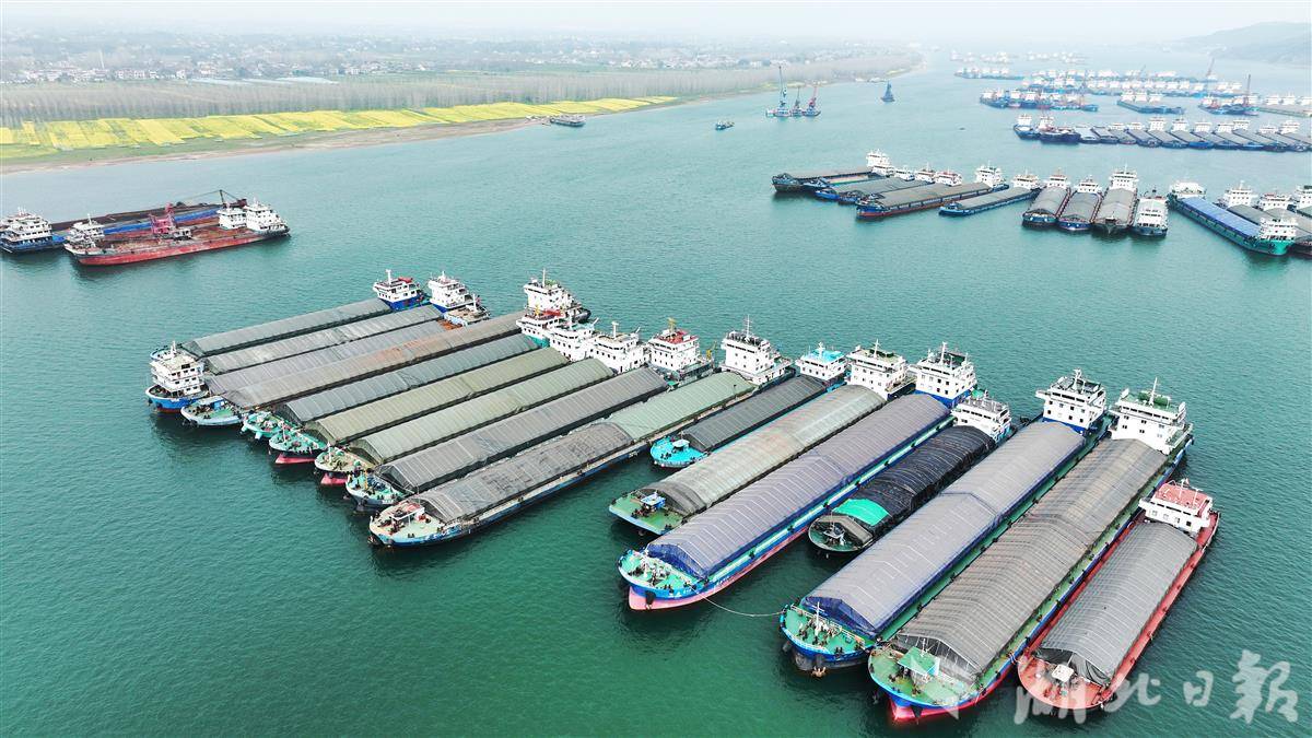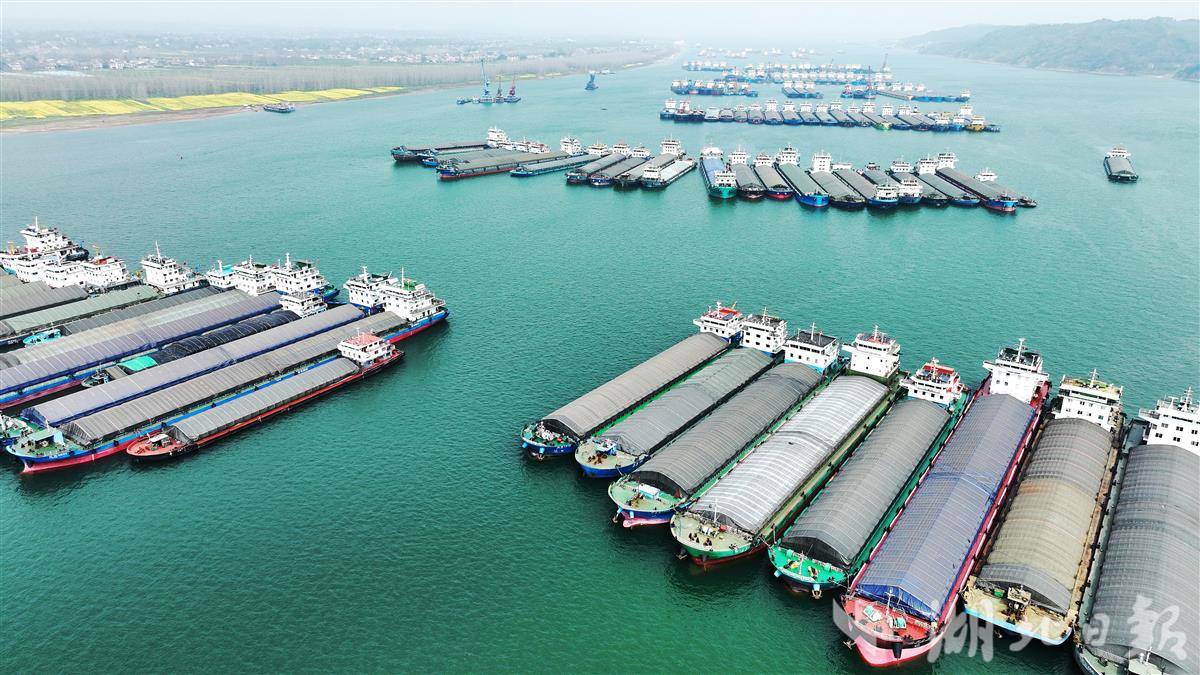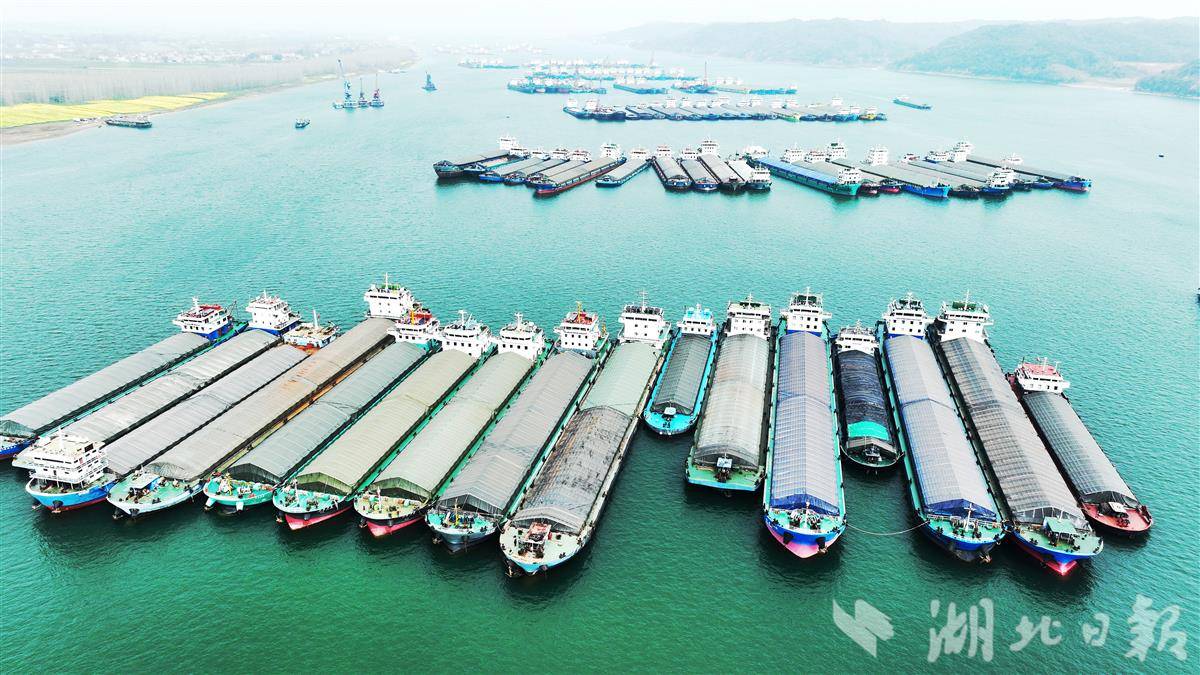 3月9日,大批货轮在枝江市罗家河锚地候闸过坝。