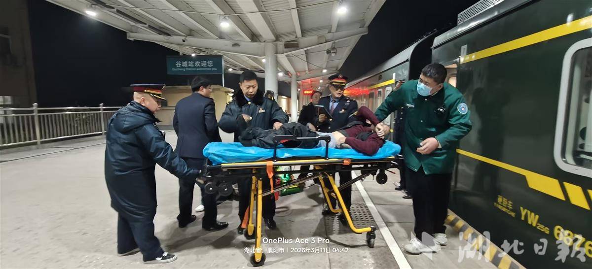 湖北日报讯(记者刘天纵、通讯员赵连斗)3月11日凌晨,一场与时间赛跑的生命救援在十堰车务段管内谷城站紧急上演。K529次列车上一名旅客“绞肠痧”发作陷入昏迷,铁路部门临时调整运行计划,紧急停靠谷城站3分钟,为旅客打通了一条“生命绿色通道”。