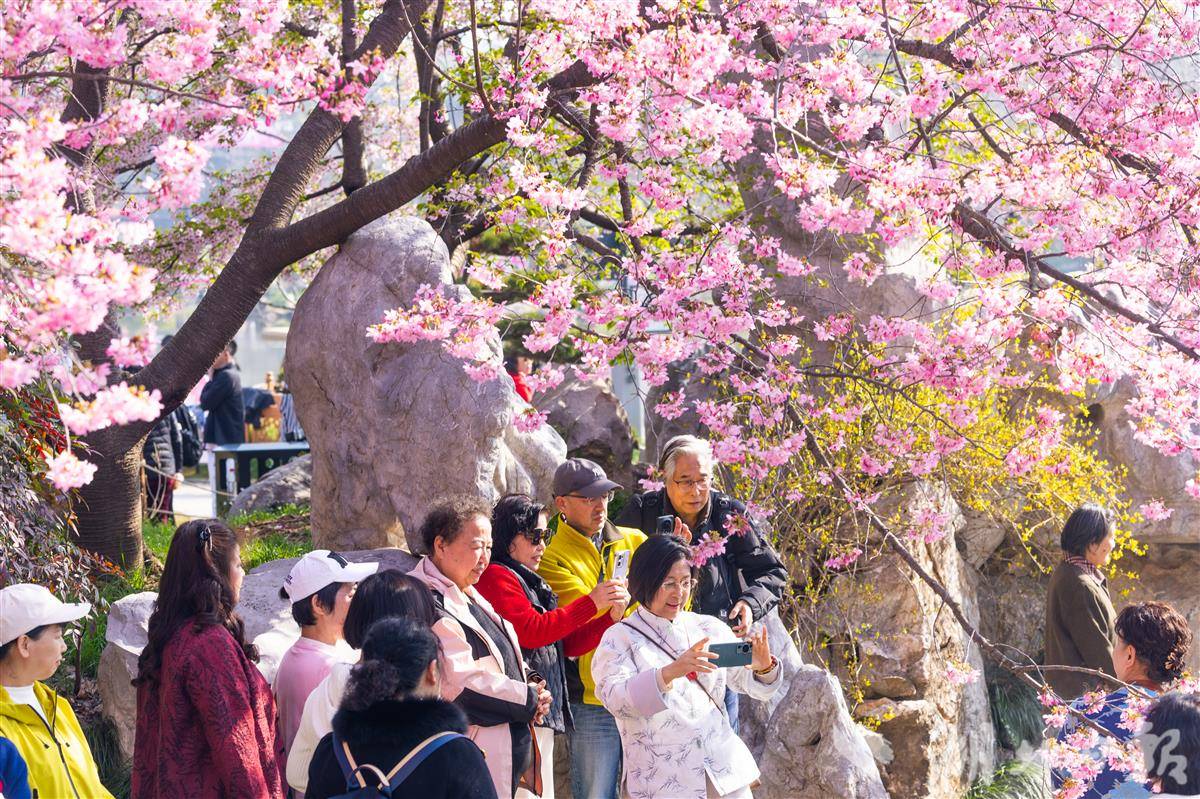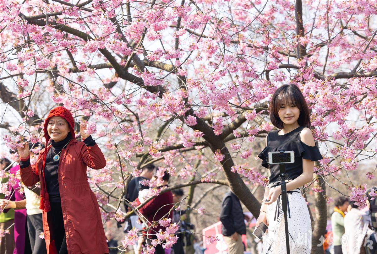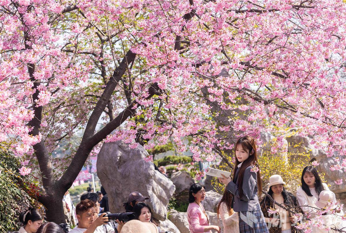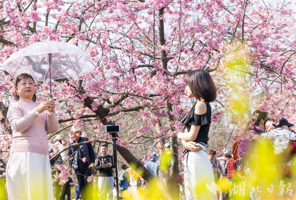3月11日,武汉东湖樱花园早樱绽放,粉红花瓣缀满枝头,吸引来自香港、广州、湖南等地游客纷至沓来,共赏春日美景,尽享浪漫春光。(湖北日报全媒记者 薛婷 摄)
