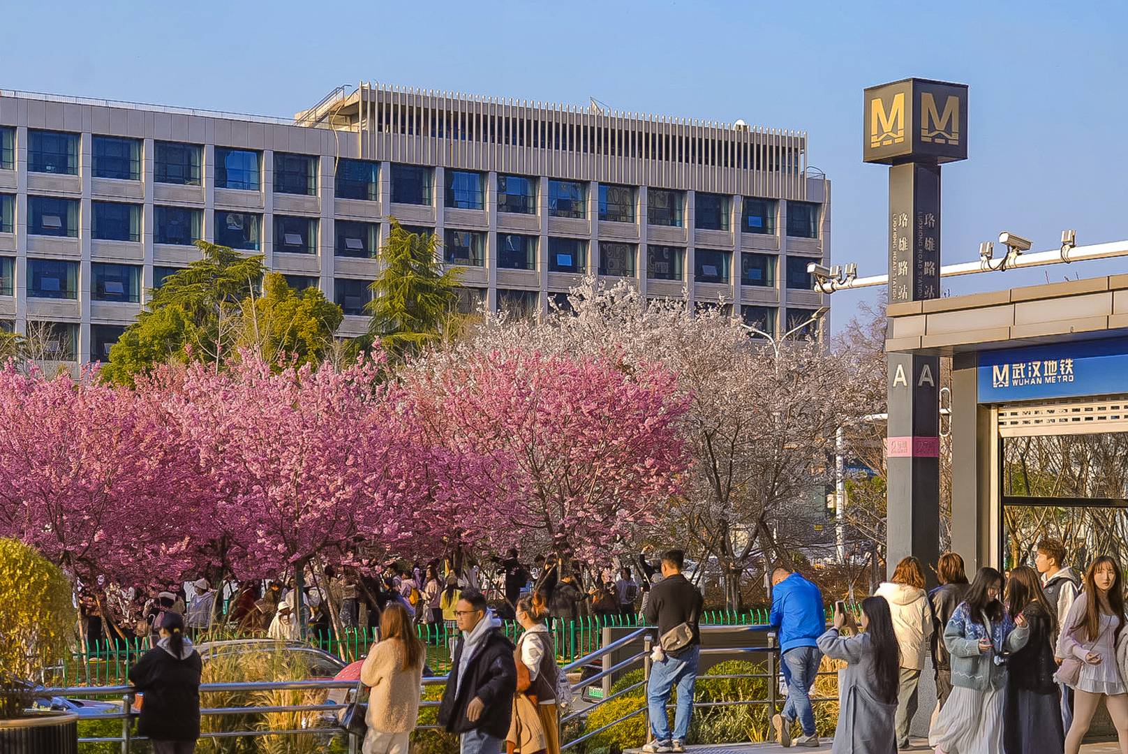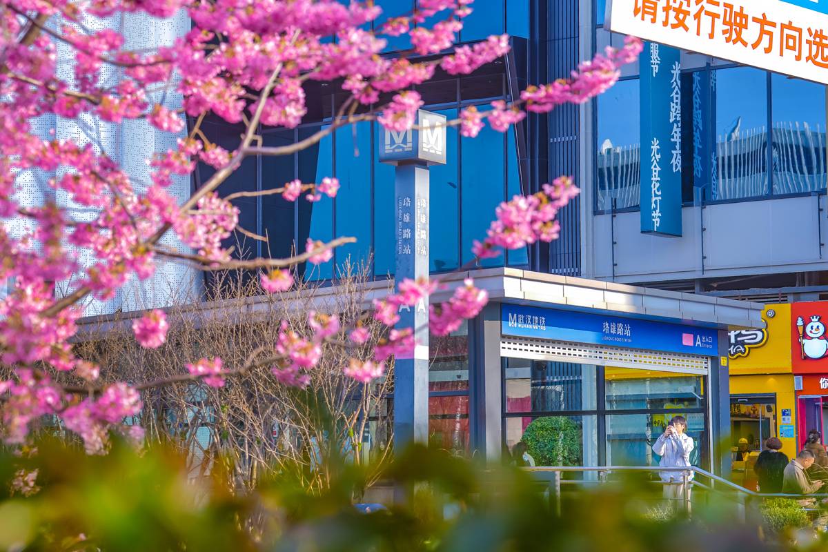 三月春风至,樱花次第开。3月10日,武汉地铁2号线光谷广场站、珞雄路站周边的早樱迎来盛花期,层层叠叠的粉白花海沿街绽放,吸引众多游客选择绿色低碳的地铁出行方式,奔赴这场浪漫的春日之约。