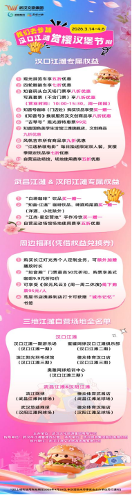 除了美食,活动还推出丰厚的文旅福利。市民游客在汉堡节商户处购买任意单品,即可领取专属权益兑换券,享受汉口、武昌、汉阳三地江滩的多样优惠,包括观光车、运动场馆五折、咖啡饮品买一赠一、知音号及文创产品折扣等。覆盖吃、玩、赏、游等多个场景,真正实现一站式畅享春日美好。