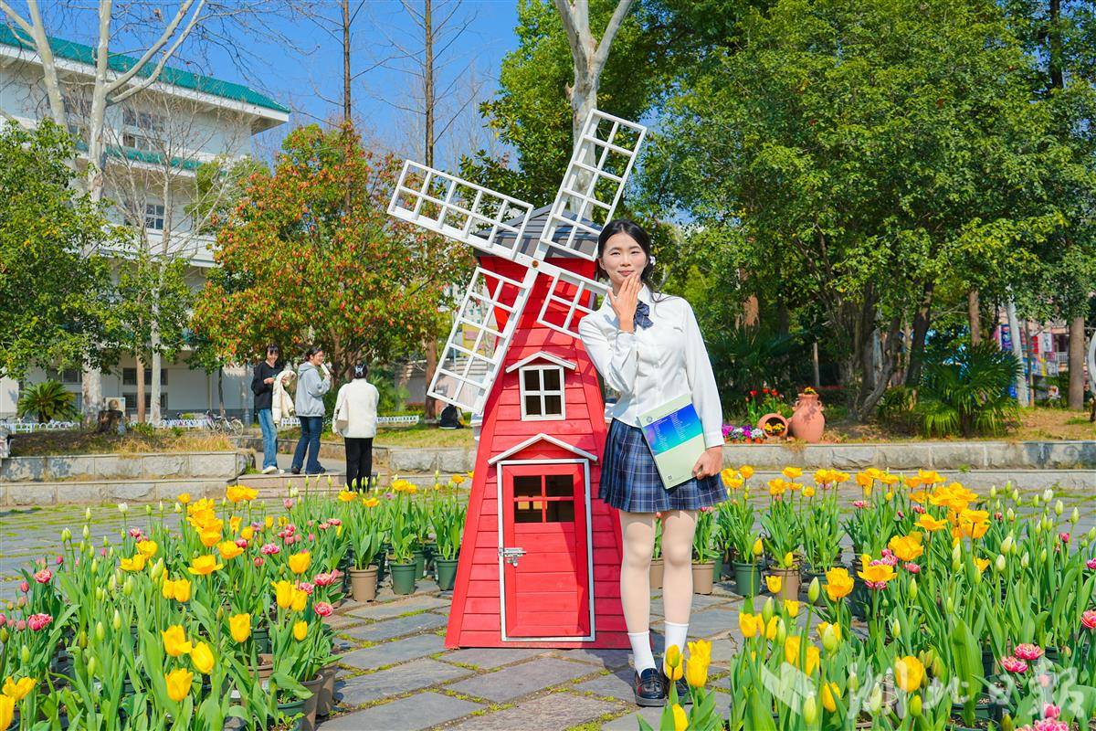 本次花展以“骐骥踏春,郁菊启新”为主题,主展区设在文化广场,次展区分布于植物园与大健康产业园,形成移步换景、处处有花的校园景观格局。主展区内,郁金香亭亭玉立,春菊烂漫铺陈。微风拂过,橙红粉紫交织成流动的彩色花溪,让师生不自觉慢下脚步,沉醉在春色里。