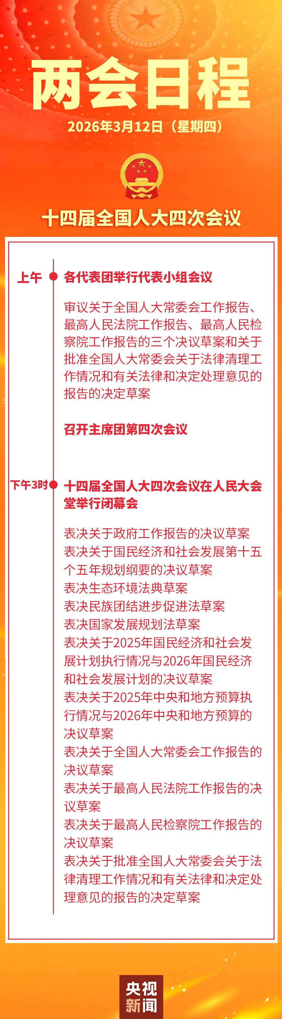 12日下午3时,十四届全国人大四次会议在人民大会堂举行闭幕会,表决关于政府工作报告的决议草案,表决关于国民经济和社会发展第十五个五年规划纲要的决议草案,表决生态环境法典草案,表决民族团结进步促进法草案,表决国家发展规划法草案,表决关于2025年国民经济和社会发展计划执行情况与2026年国民经济和社会发展计划的决议草案,表决关于2025年中央和地方预算执行情况与2026年中央和地方预算的决议草案,表决关于全国人大常委会工作报告的决议草案,表决关于最高人民法院工作报告的决议草案,表决关于最高人民检察院工作报告的决议草案,表决关于批准全国人大常委会关于法律清理工作情况和有关法律和决定处理意见的报告的决定草案。