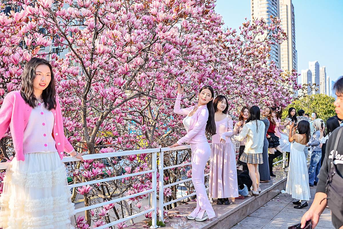 花白如玉,吐气如兰,梅花之后,玉兰悄然登场。3月11日,武汉汉口江滩公园的玉兰花枝摇曳,春意盎然。市民们纷纷走出家门,在玉兰树下打卡拍照,感受这美好春光。