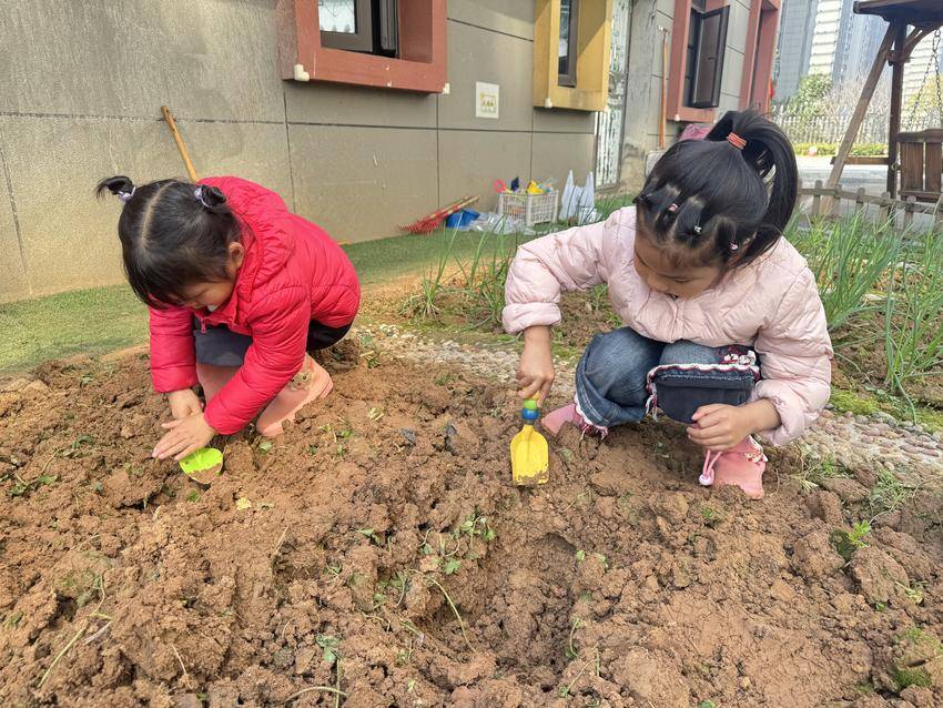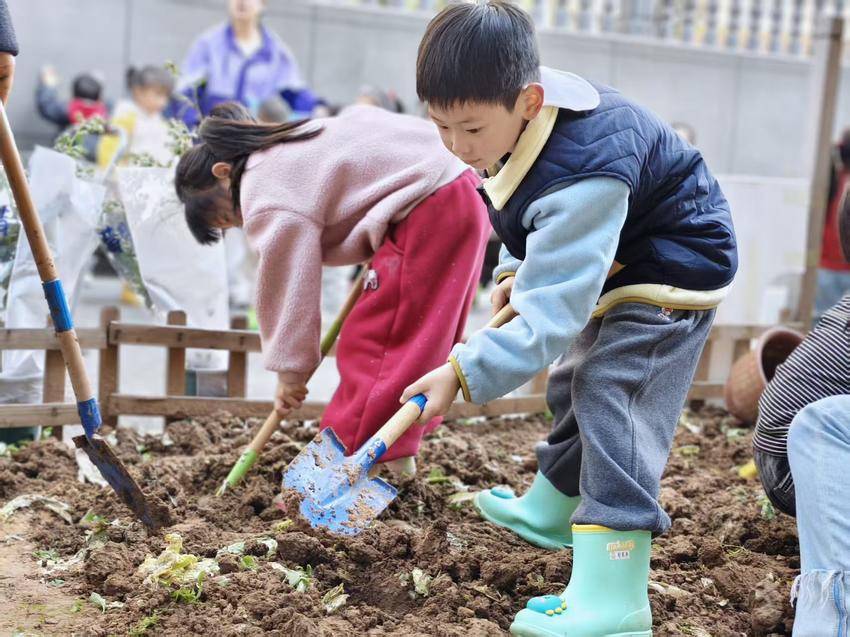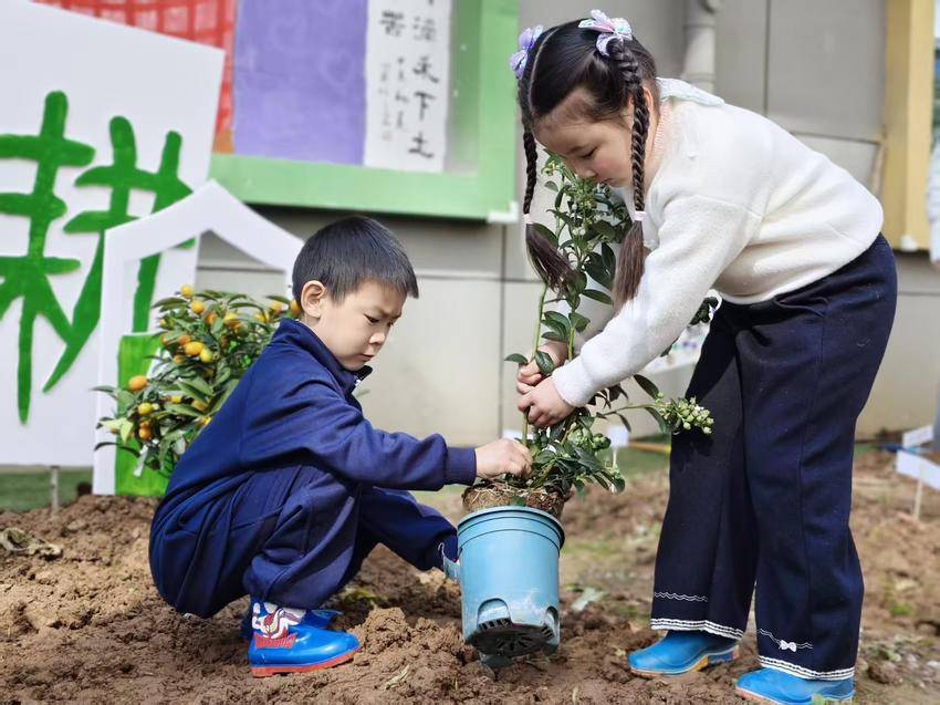 小班萌娃在户外操场化身小小绘画家,以手掌涂鸦创作春日大树,在色彩创作中感受自然之美;中班幼儿于郡幼小院开展田间播种,认识土壤、学习播种步骤,种下向日葵等种子并做好标记与观察约定,在实践中培养责任意识;大班孩子分组协作种下金桔、蓝莓树苗,在挖坑、放苗、浇水等全套操作中体验集体劳动的快乐。
