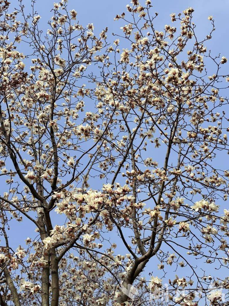 与樱花的烂漫不同,园区主干道两旁的玉兰花则以“雅”字取胜。50余株白玉兰、紫玉兰正值佳期,白玉兰如羊脂美玉挂满枝头,紫玉兰则更显高贵典雅。在湛蓝天空的映衬下,无需绿叶衬托,自成一幅韵味悠长的古典画卷,为月湖增添了沉静而高级的春日气韵。