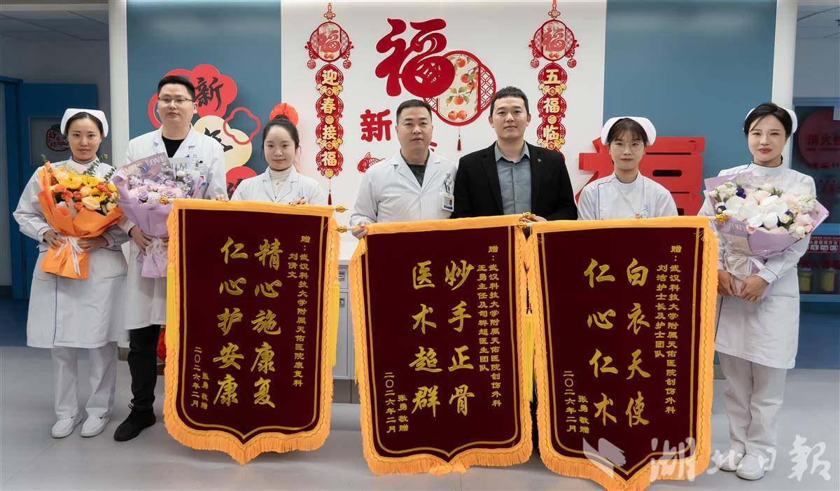 湖北日报讯(记者曾莉、通讯员胡然、吕怡飞)40岁患者张先生因左踝关节骨折在武汉科技大学附属天佑医院创伤外科接受治疗,经科室实施精准手术及“手术+康复”一体化诊疗后,关节功能完全恢复、重返正常生活。近日,张先生特向该科赠送锦旗。