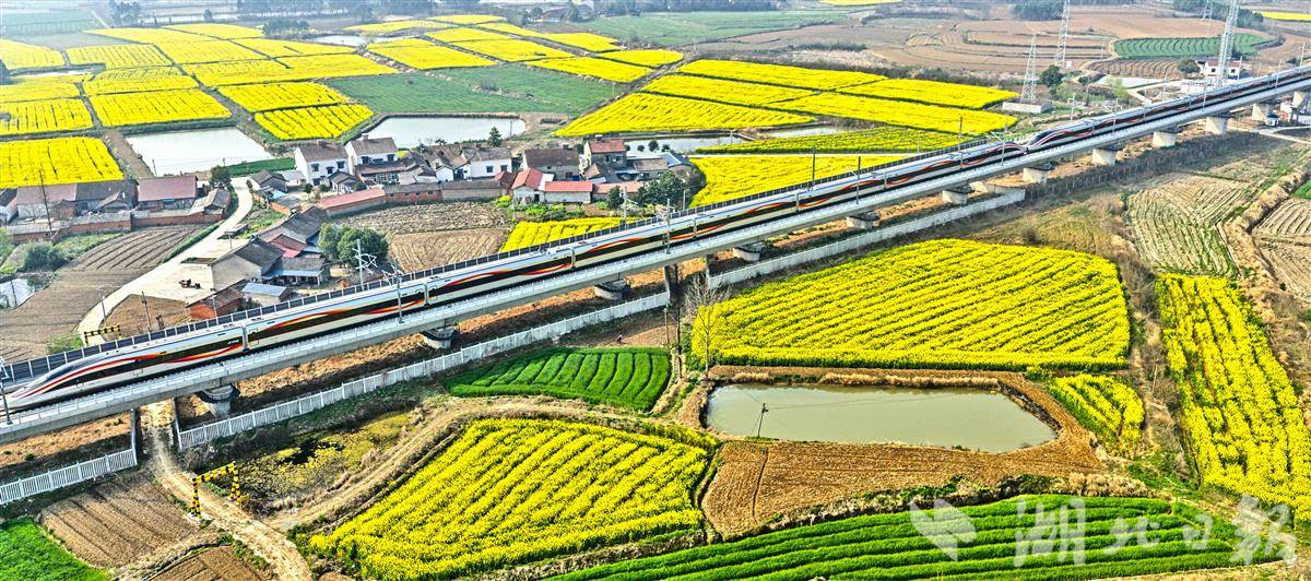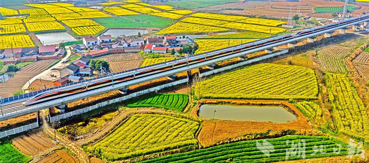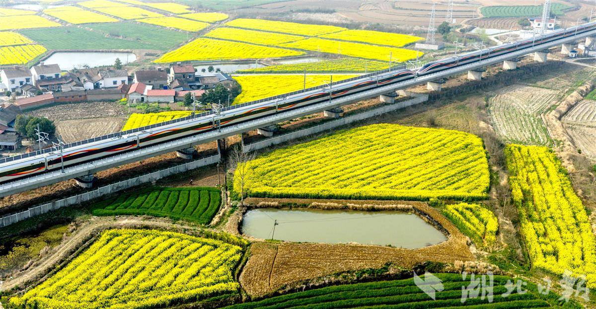 3月12日,宜昌当阳市庙前镇千亩油菜花迎春盛放,金黄花海随风翻涌,一列高铁呼啸穿行其间,勾勒出“春和景明、铁龙逐春”的荆楚春日画卷。