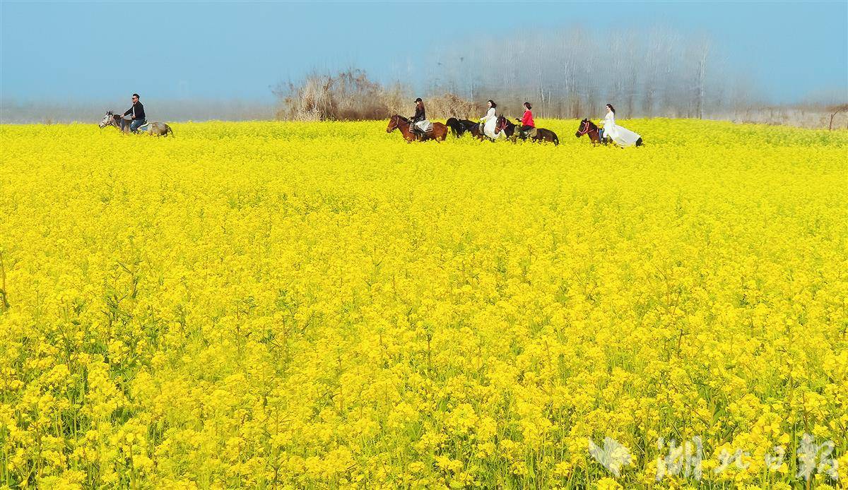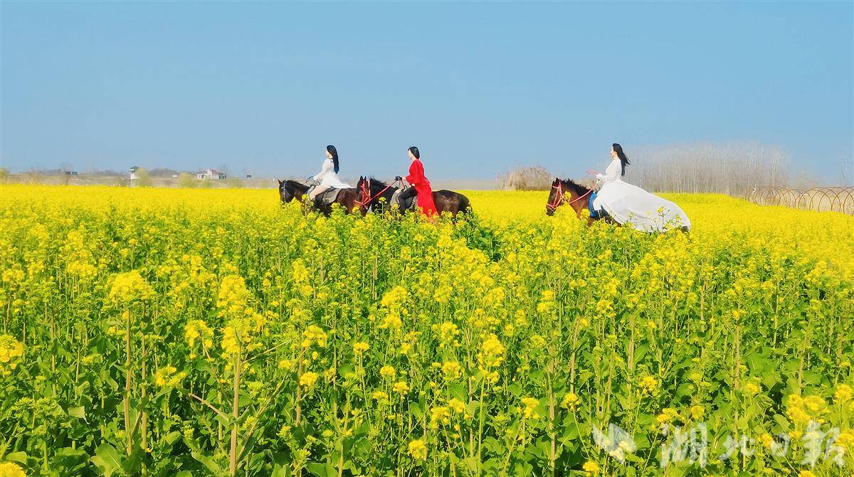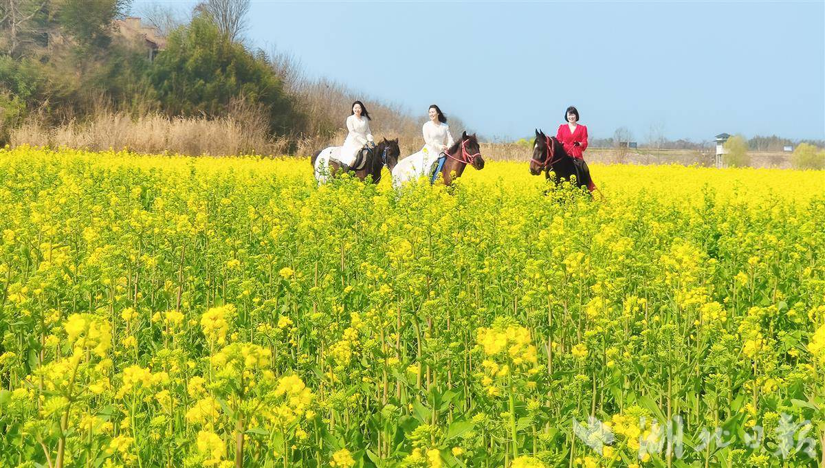 3月11日,鄂州市段店镇中湾村油菜花竞相绽放,游人徜徉花海、骑马赏花,尽享春日美景。