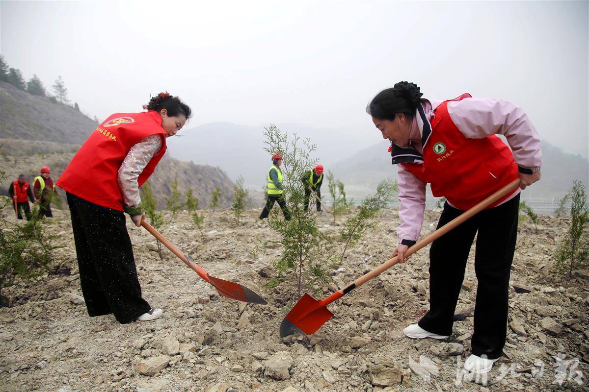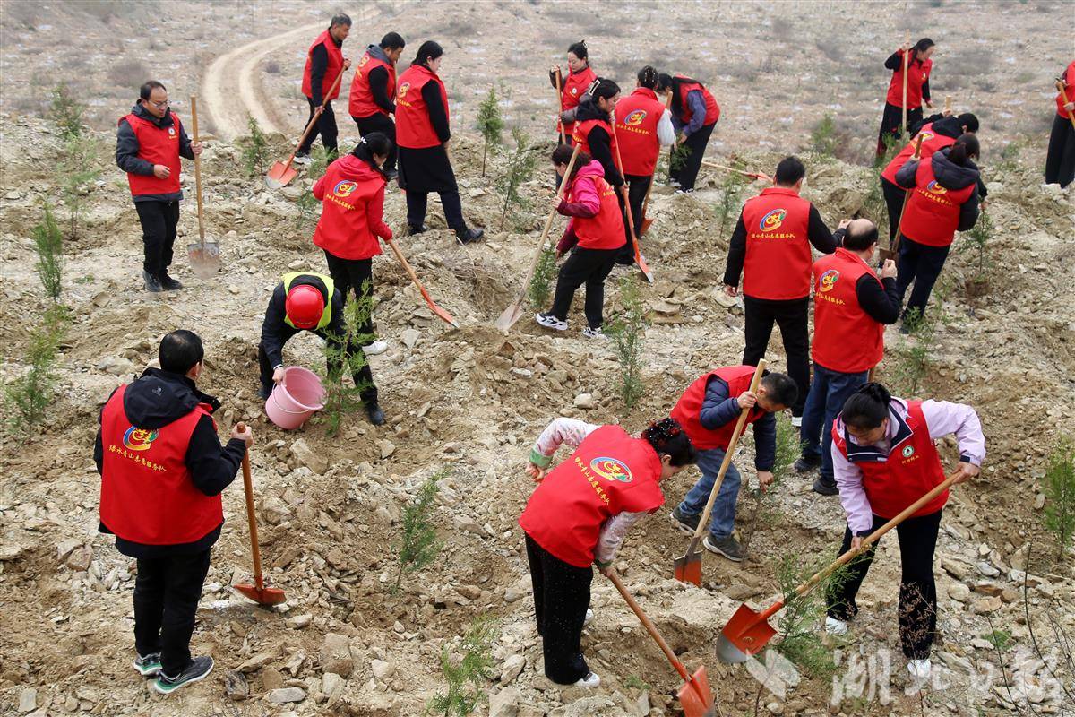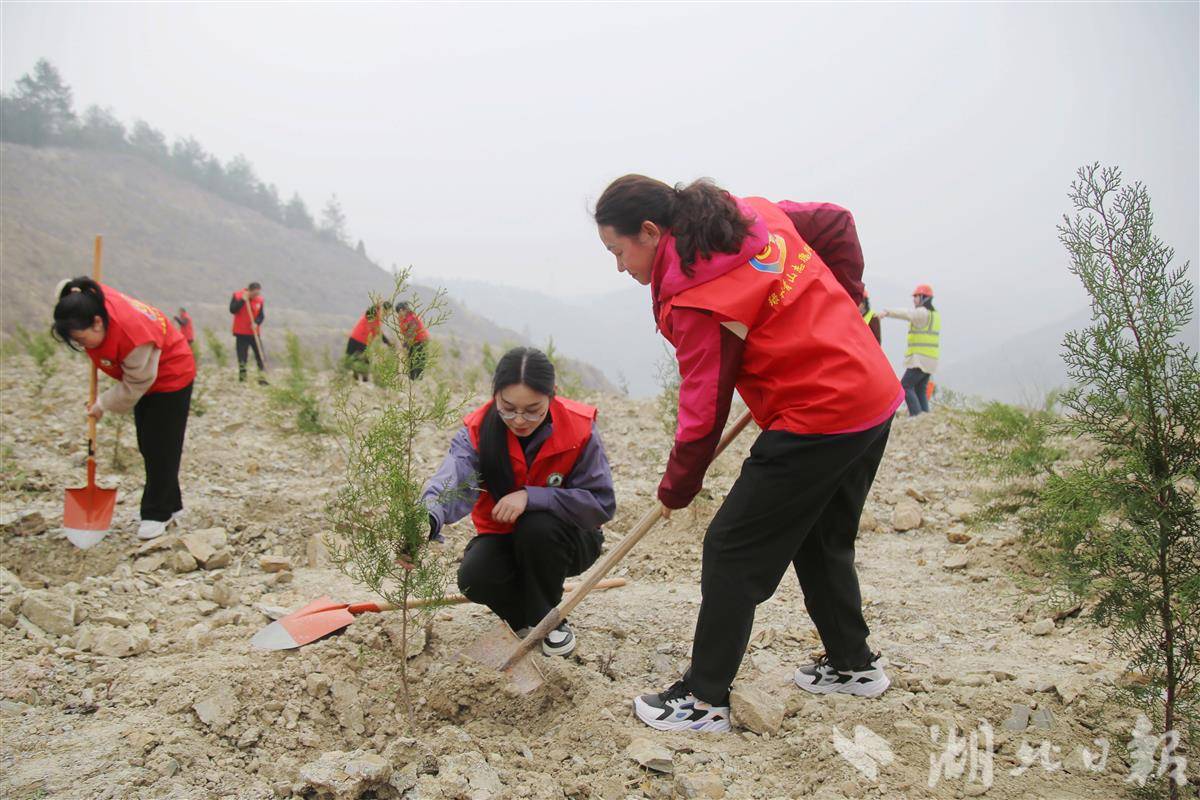 3月12日,志愿者在十堰市郧阳区茶店镇玄岳大道附近山头植树。