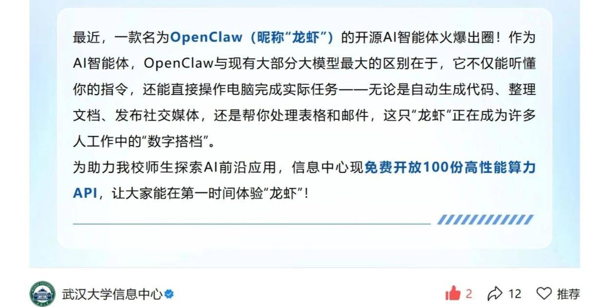 3月10日,武汉大学信息中心一项特别的“福利”在校园里悄然上线——免费向学生发放100份高性能算力API,用于体验一款名为OpenClaw(昵称“龙虾”)的开源AI智能体。消息通过学校公众号发布后,迅速点燃了学生们的热情。