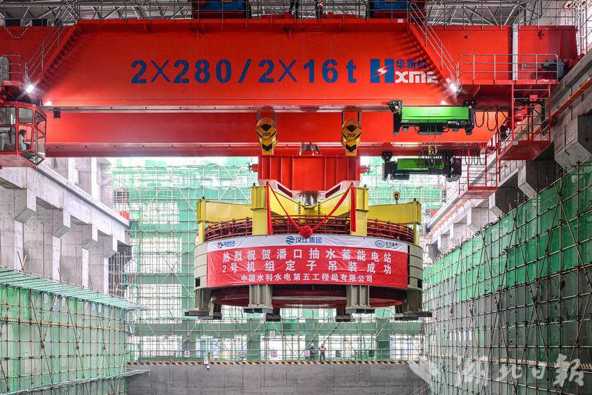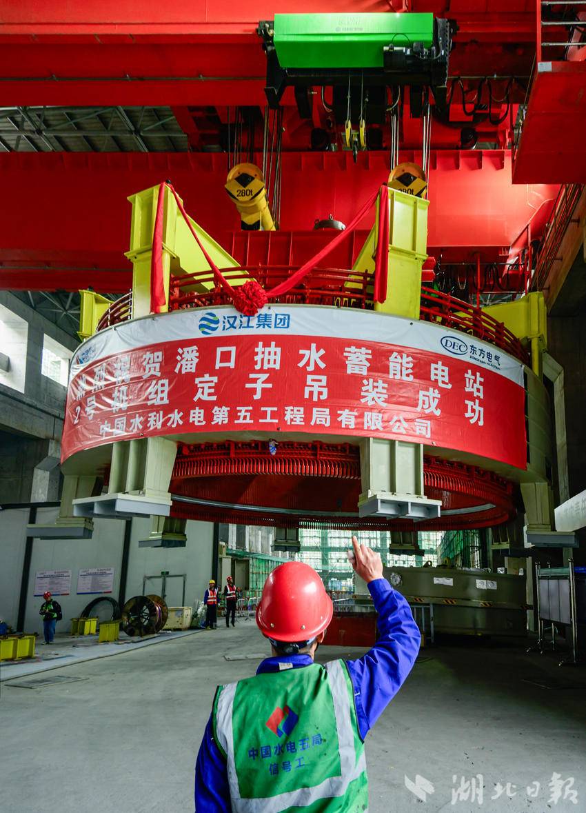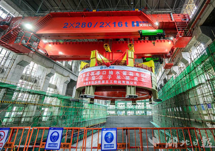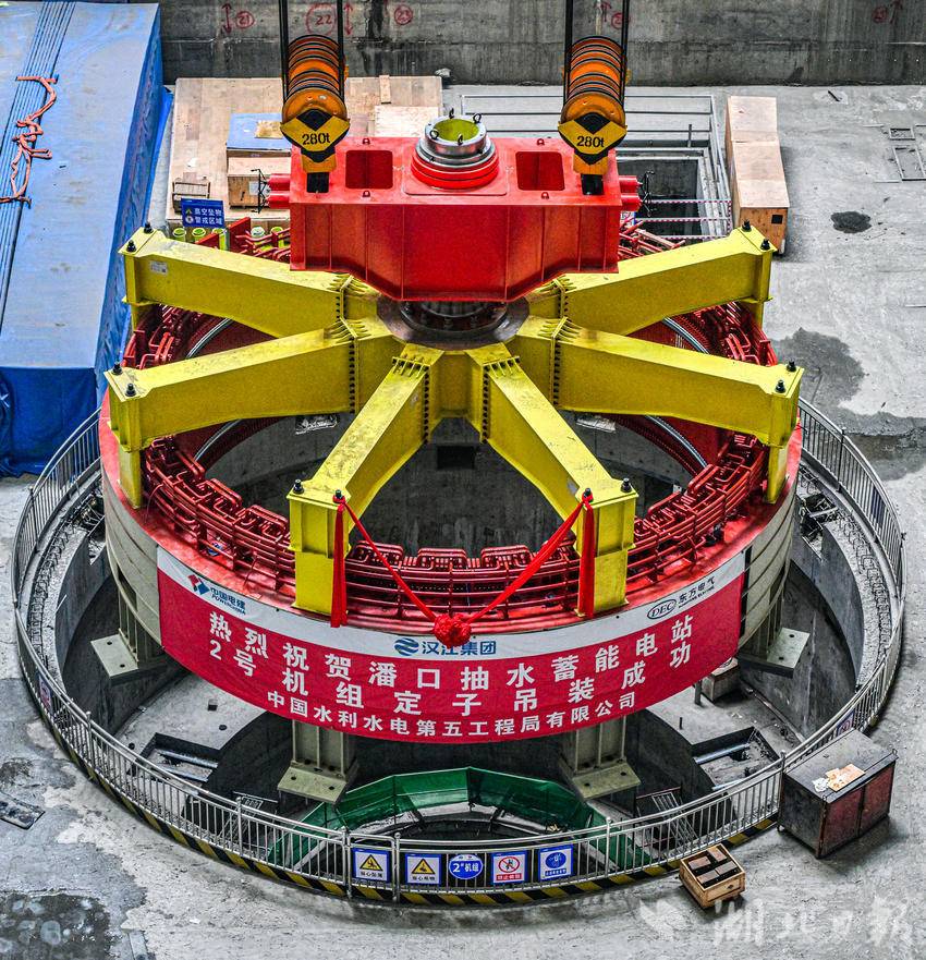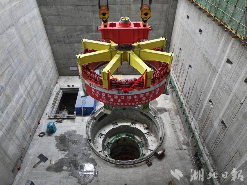 湖北日报讯(通讯员石濡华、陈宝林、李梦雨)3月12日,在湖北省十堰市竹山县潘口抽水蓄能电站水电机房内,中国水电五局工作人员将一个205吨的定子精准吊装到2号机组机坑。至此,电站内两台机组定子全部吊装完成,标志着电站机电设备安装取得重大阶段性成果,为后续机组总装、调试及按期投产奠定坚实基础。