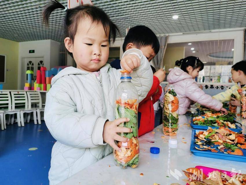 小班幼儿开展“自制绿色肥料”趣味活动。在老师引导下,孩子们用落叶、果皮等可降解材料,动手制作有机肥料,初步感知垃圾分类与循环利用,用小小的行动为植物生长助力。
