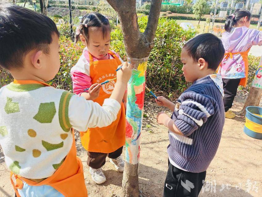 中班幼儿以创意绘画为园门口小树“换新衣”。孩子们拿起画笔,大胆配色、尽情创作,把对自然的喜爱画在树干上,让原本朴素的小树披上色彩斑斓的“新衣”,成为校园里一道童趣盎然的风景线。