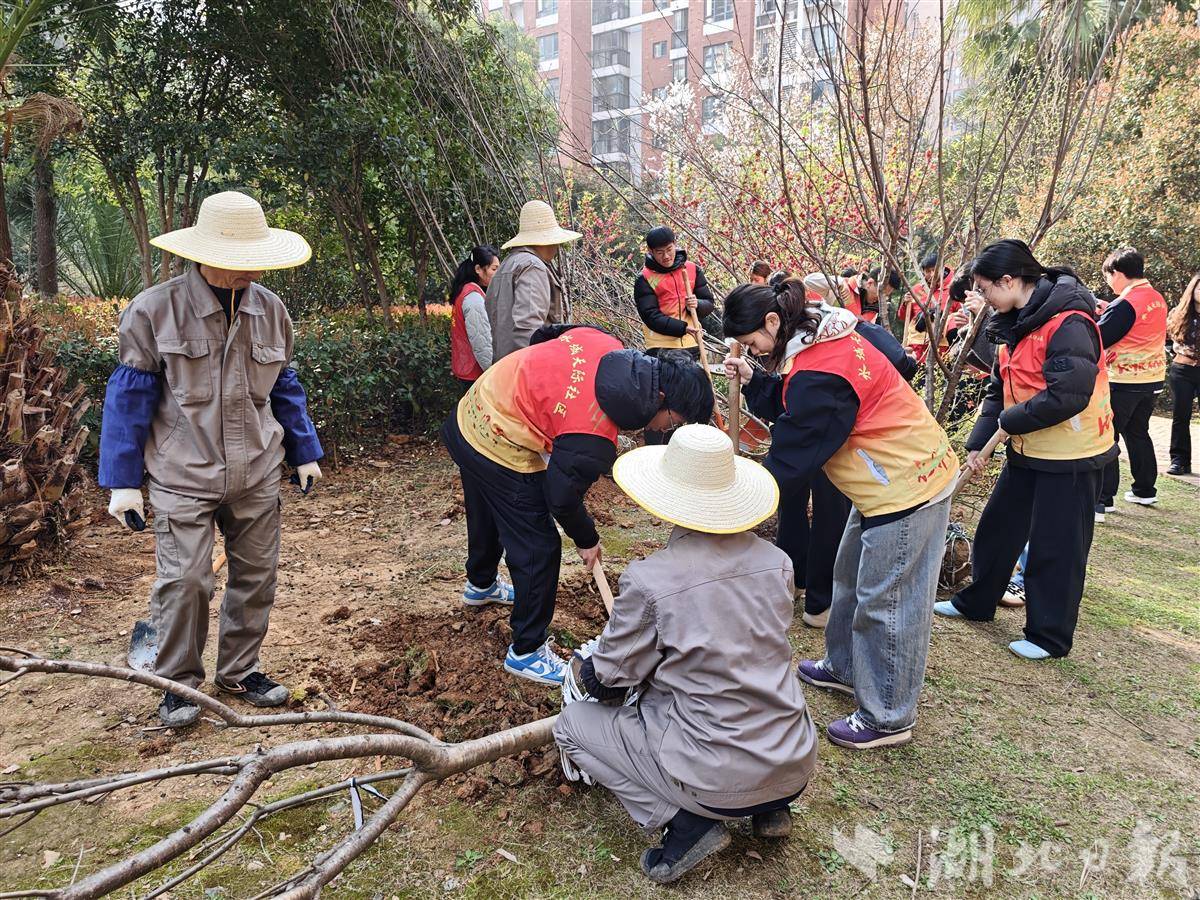 湖北日报讯(记者李光正、通讯员刘淑萍)3月12日上午,武汉市武昌区南湖街道水域天际小区内一片热火朝天的劳动景象。小区物业牵头组织,水域天际社区携手武昌首义学院经济学院青年志愿者、可得龙幼儿园师生及志愿者代表,共同开展“播种绿色希望,共建美好家园”主题植树活动,用实际行动为家园增添新绿。