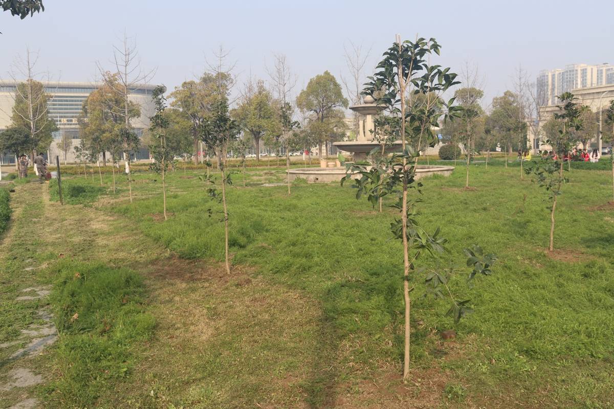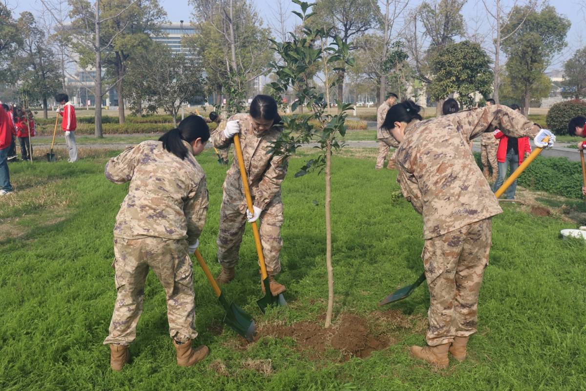 挖坑、扶苗、培土、浇水、定根,学院园林专业的张露萍老师一边讲解一边示范,既教大家提高植树效率,又教大家确保树苗成活的方法。干休所官兵、文职人员与大学生3人一组协作,按照“坑深要达40厘米,根系必须舒展,填土要分三次踩实”的科学种植法。不一会儿工夫,一排排桂花树栽种完成,像祖国边疆站岗放哨的士兵挺拔矗立,成为校园里一道靓丽的绿色风景线。
