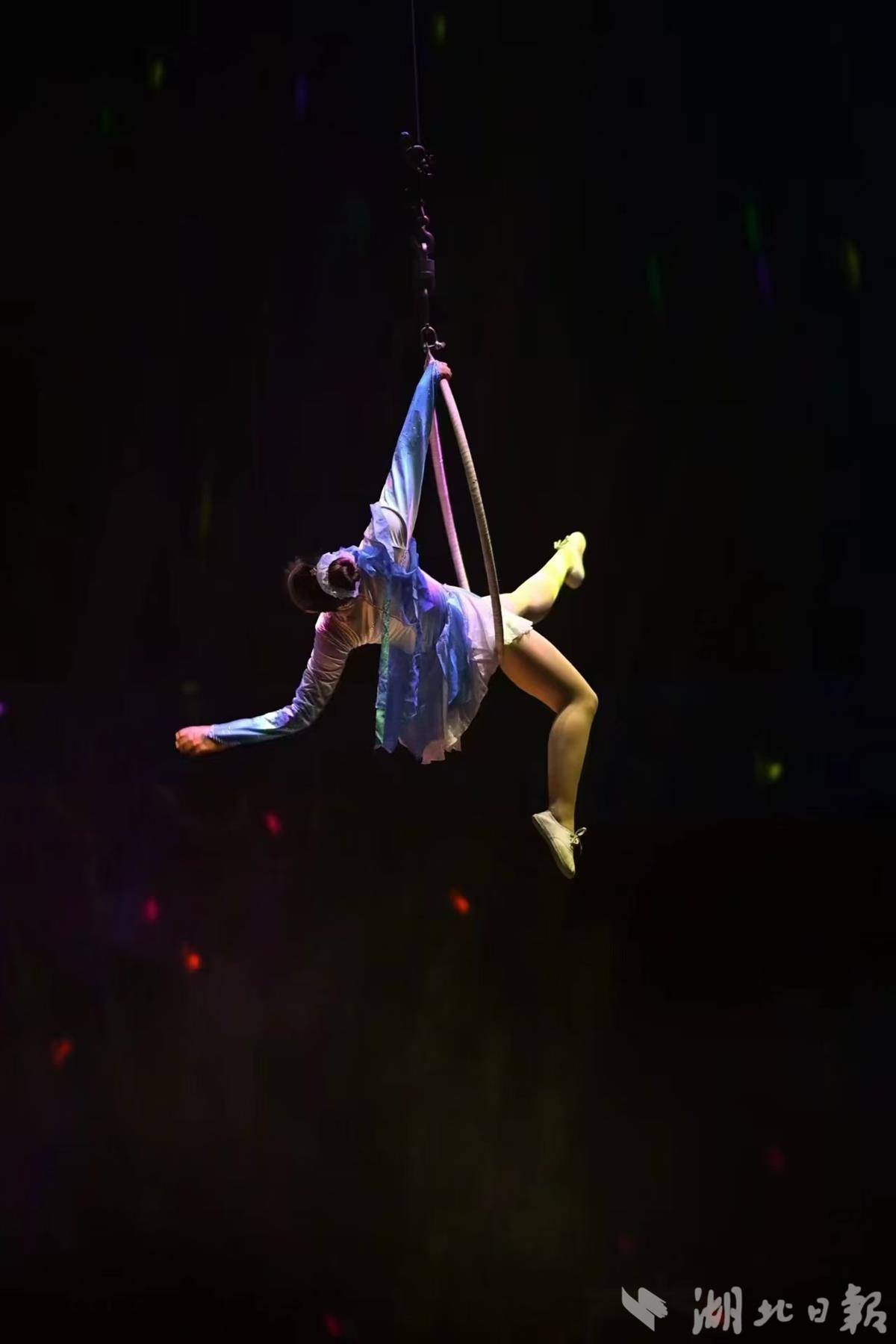 10日演出现场,新编排的双人绸吊节目《珞樱云绸》中,伴随着经典旋律《神话》缓缓响起,两位演员借助两条绸缎在空中盘旋、缠绕、升腾。节目的舞台背景,正是东湖盛放的樱花海,粉色花瓣与演员飘逸的身姿交相辉映,仿佛仙境眷侣在云端诉说旷世之恋。