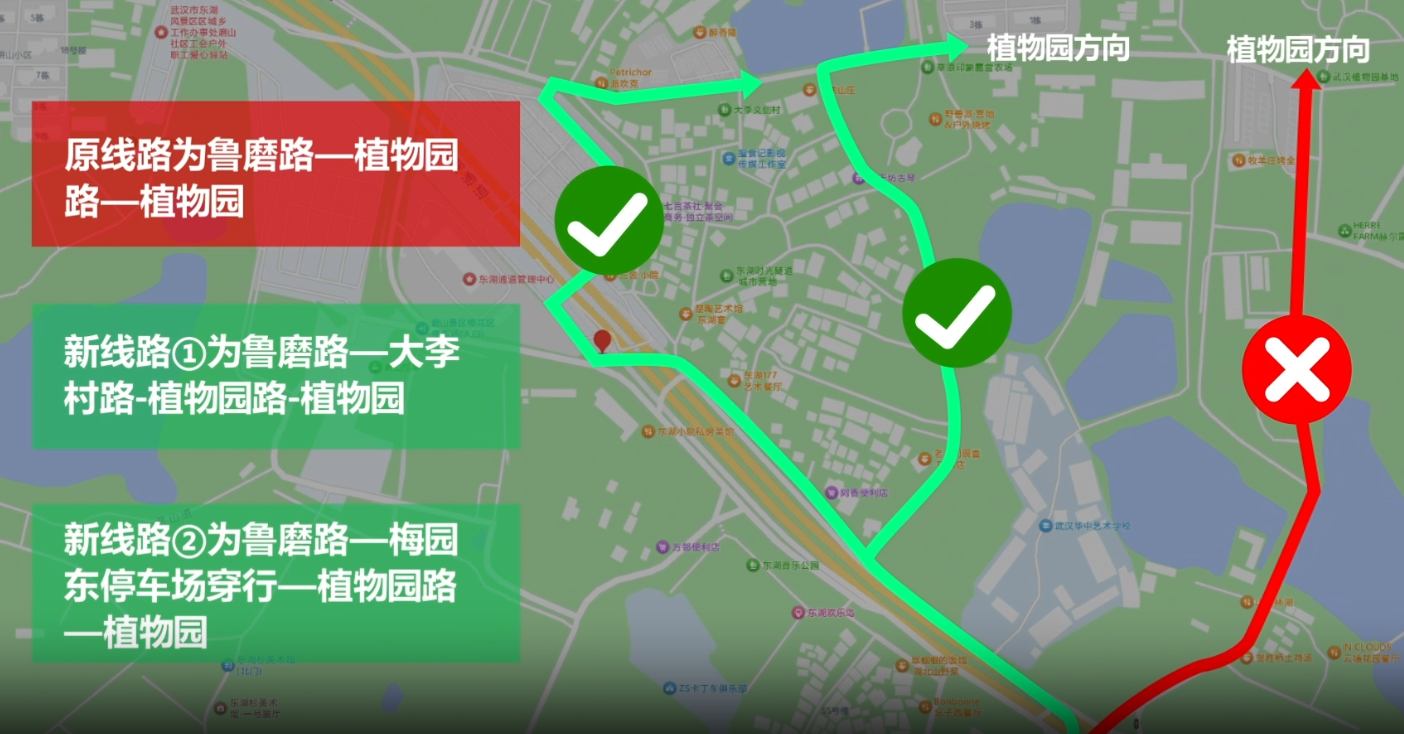 前往植物园:可经大李村路通行,或借道梅园东停车场穿行。