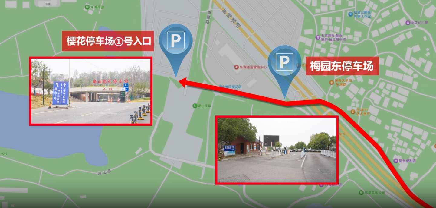 前往樱花园:导航至 “磨山樱花停车场”,从 1 号门驶入;或导航至 “梅园东停车场”,驶入即可。