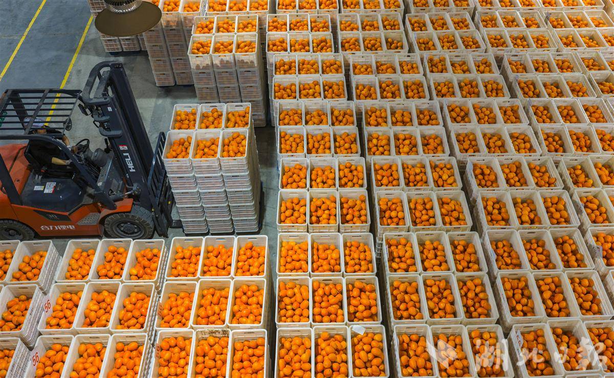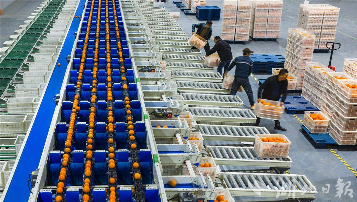 在秭归县县城长江边电商园内,刚收获的中华红脐橙正在生产线上进行清洗、分级。