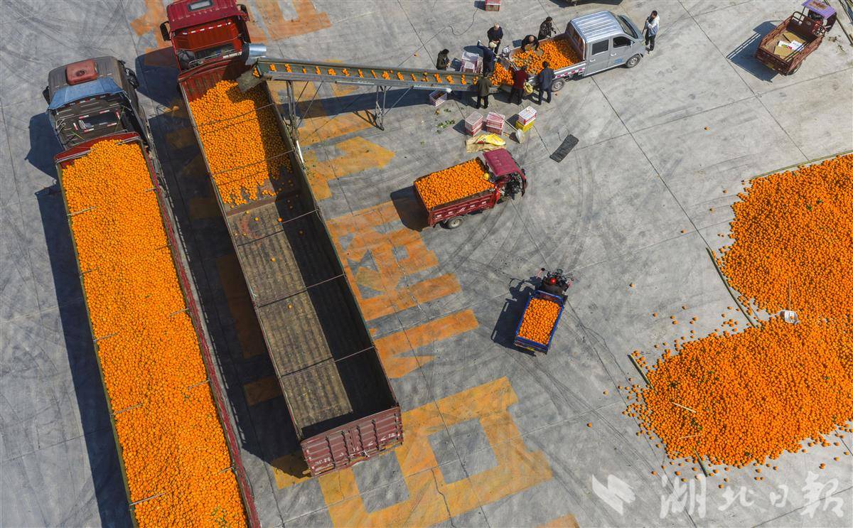 工人在秭归县归州镇彭家坡村对刚收获的中华红脐橙进行装车。