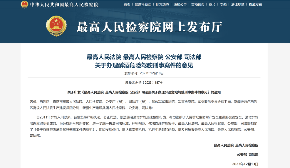 这份饱含民生关切与法治思考的代表建议,很快转化为法治实践的有力举措。黄立提出的四大核心建议及具体实施细则,均在2023年12月最高人民法院、最高人民检察院、公安部、司法部联合发布的《关于办理醉酒危险驾驶刑事案件的意见》中得到全面采纳,具体对应契合度极高,并于当年12月28日正式施行,为醉驾案件办理划定了更科学、更规范的司法标尺,也让人大代表的履职呼声真正落地生根。