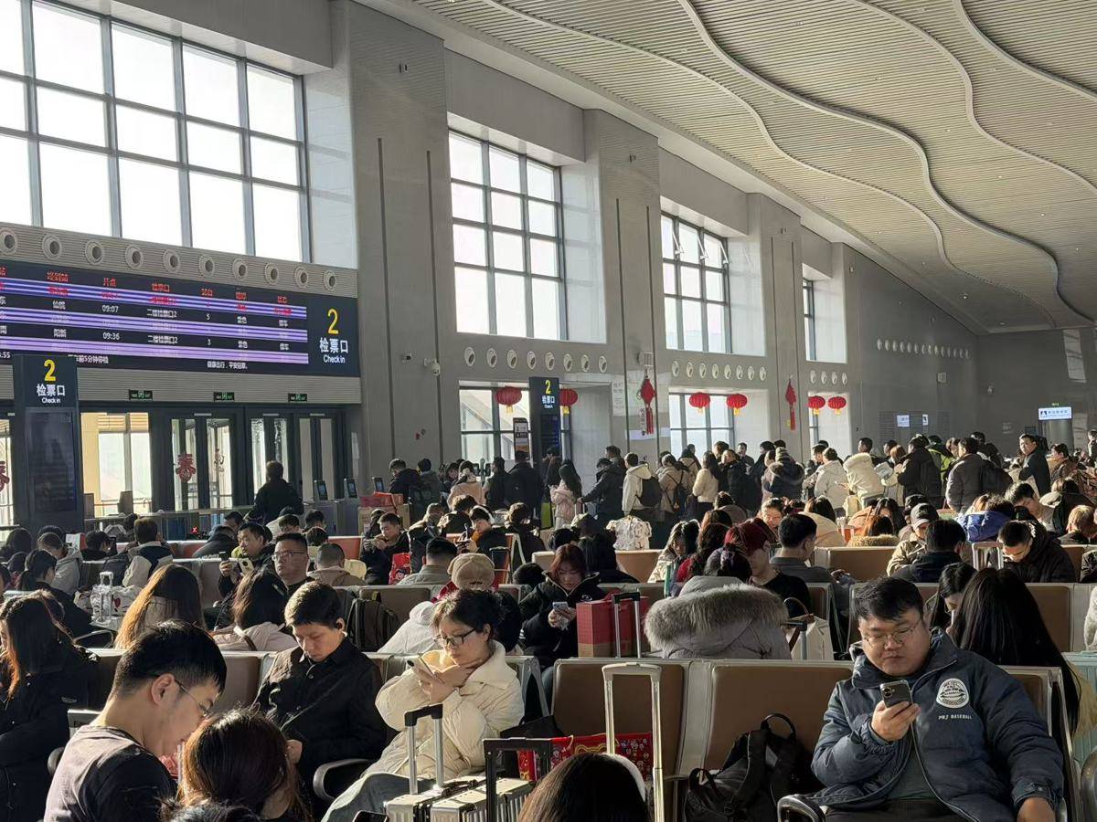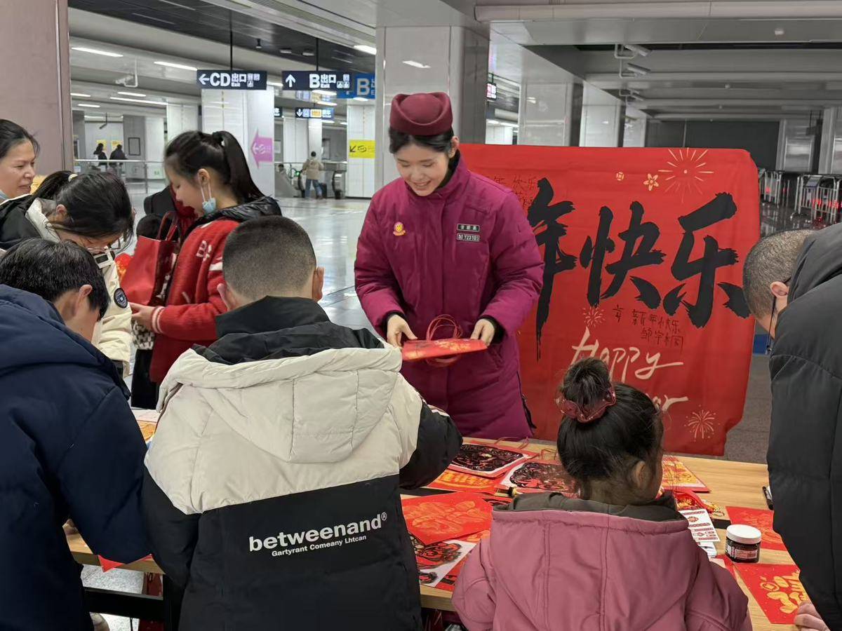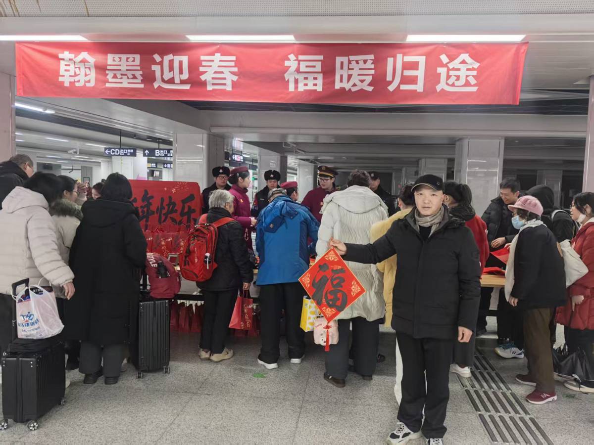 候车大厅中,大屏上播放着喜庆的祝福视频,广播里时不时传来安全提醒和“失物招领”信息,角落里在开展“送春联、送‘福’字”活动,领到的旅客都喜笑颜开,有的人举着“福”字,借着候车厅背景拍照。我忽然觉得,这里不只是一个交通枢纽,更是一个装载着无数期待与祝福的容器。