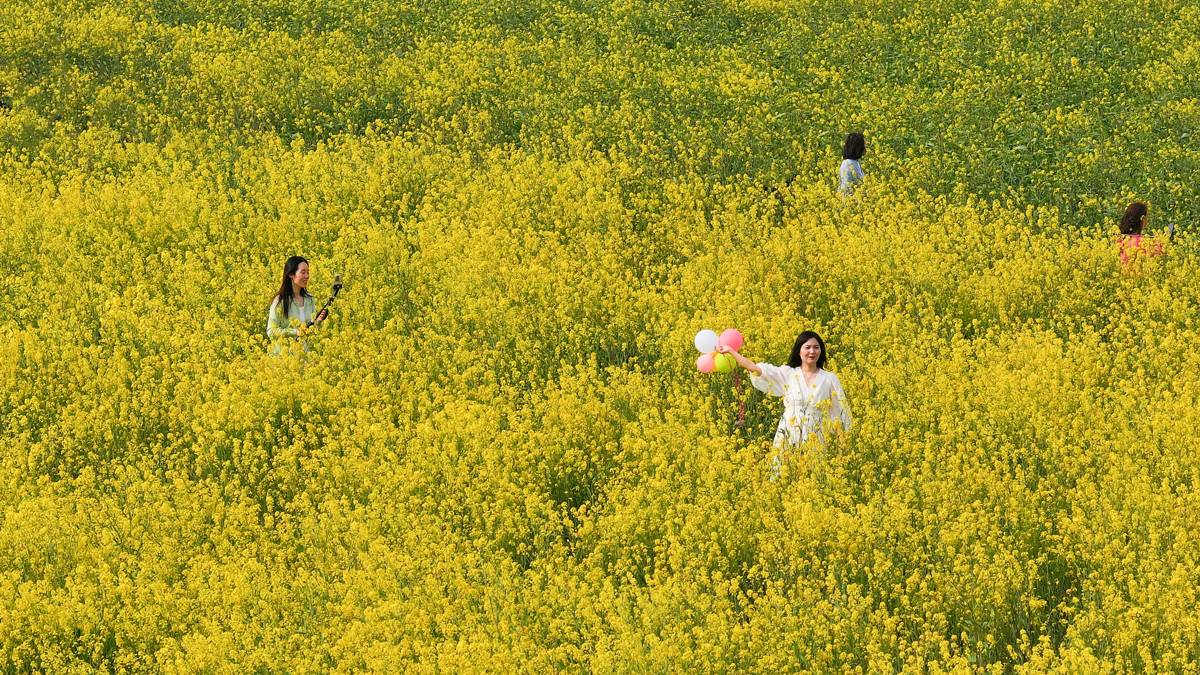 花田间的赏花步道上,游客们纷至沓来,或徜徉花海,或举起相机定格这限定的春日美景。