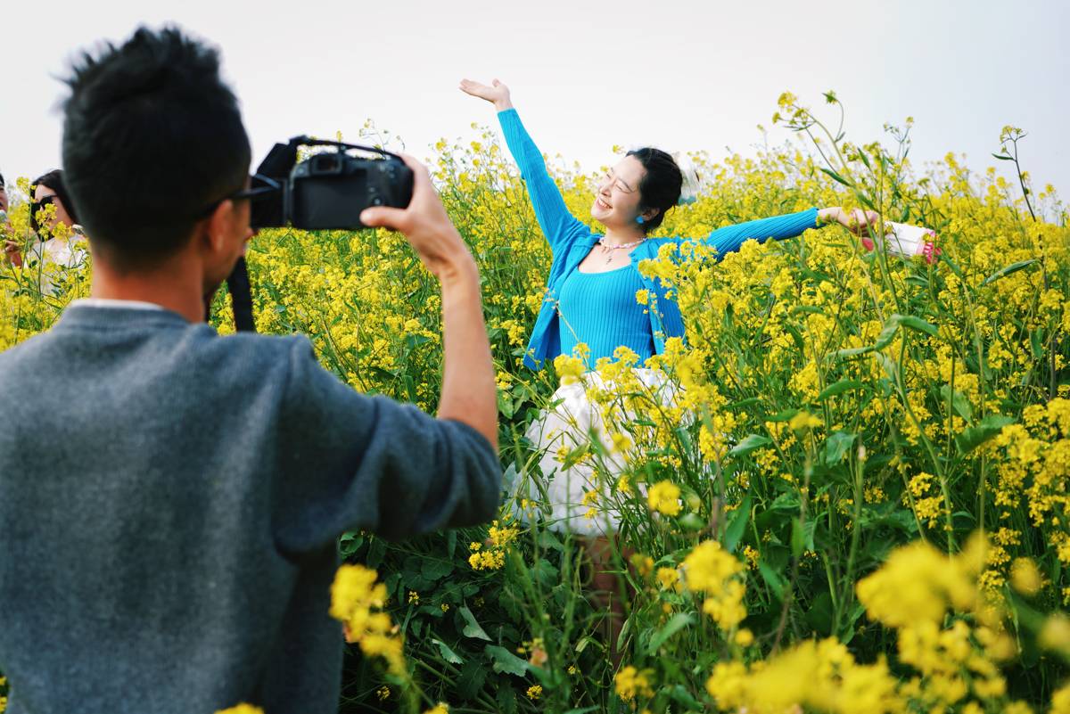 游客在油菜花田拍照打卡。(湖北日报全媒记者 赵怡然 摄)