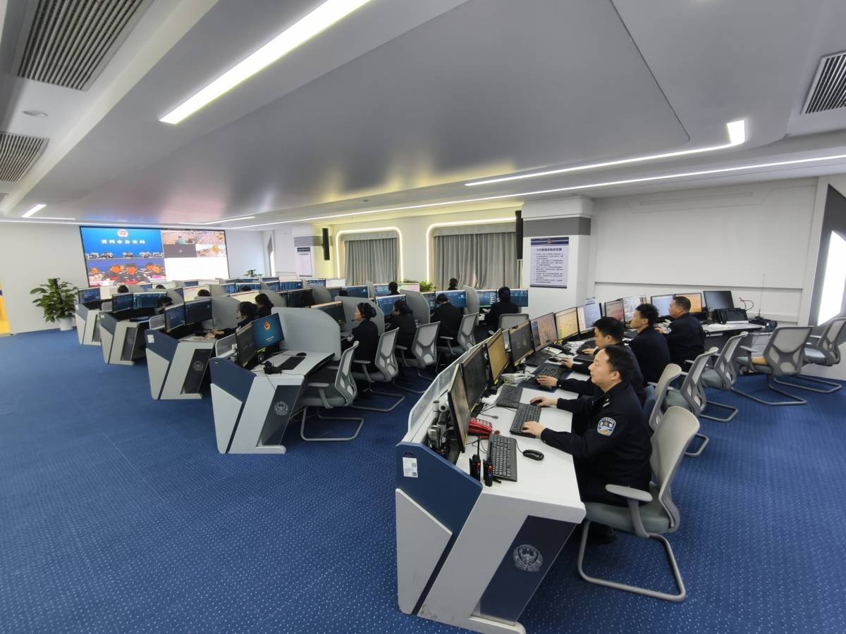 紧张运作中的黄冈110情报指挥中心。(湖北日报全媒记者刘毅摄)