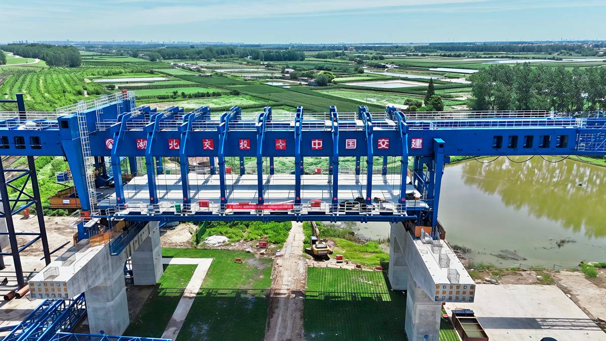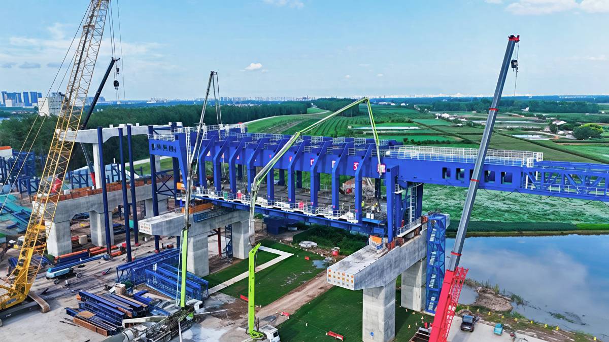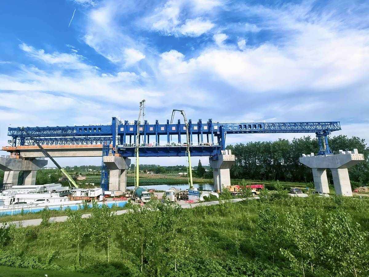 如今,蓝色的“移动筑梁工厂”在长江畔稳步前行,11跨箱梁已浇筑完成,引桥正节节生长。