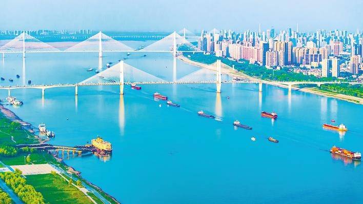 在长江武汉段江面上,货船有序穿梭,素有“黄金水道”之称的长江航运呈现一派繁忙运输景象。(湖北日报全媒记者 任勇 摄)