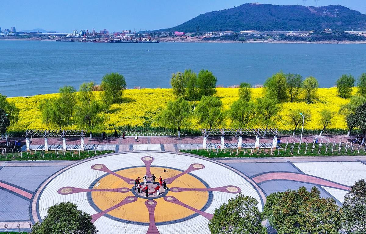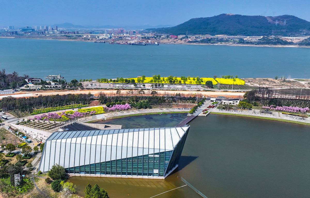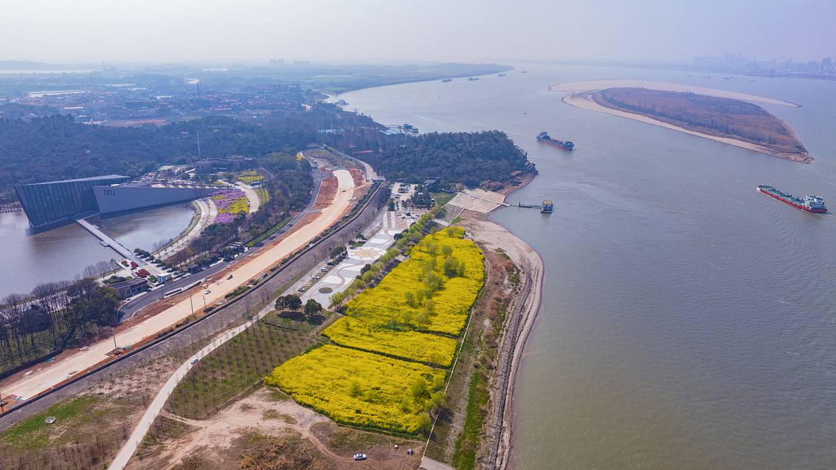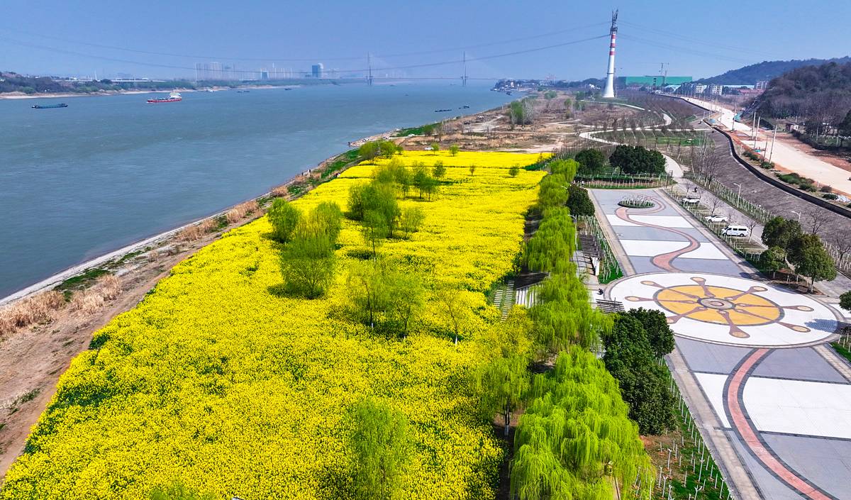 3月12日,鸟瞰中山舰博物馆油菜花海花海面积约100亩位于武汉市江夏区金口街中山舰路特一号的长江畔。近日,随着气温回暖,武汉的油菜花竞相绽放,金色的花海与青山绿水相映成趣,绘就一幅生机盎然的春日画卷。(湖北日报全媒记者 朱熙勇 摄)