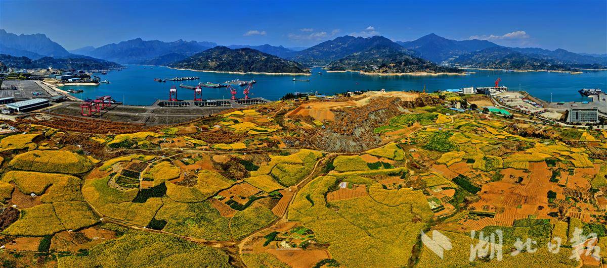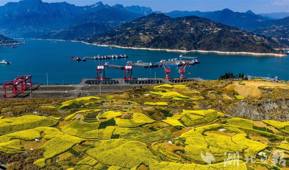 湖北秭归,长江岸边油菜花次第盛放,金色花海与码头红色岸桥、繁忙货轮相映成景。工业硬朗线条与田园柔美风光碰撞交融,春风拂过,花香与江风交织,绘就一幅春日峡江的绝美画卷。