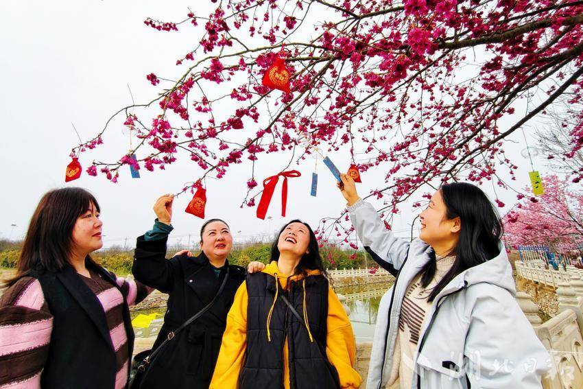 樱花树下挂祈福带的人们。常明 摄