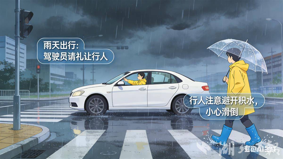 雨天行人视线也会受影响,驾车时要多留心、多礼让。遇到行人提前减速,不与行人抢道;经过积水路段慢行,别把积水溅到行人身上;留意路边行人动态,防止对方因路滑突然摔倒。