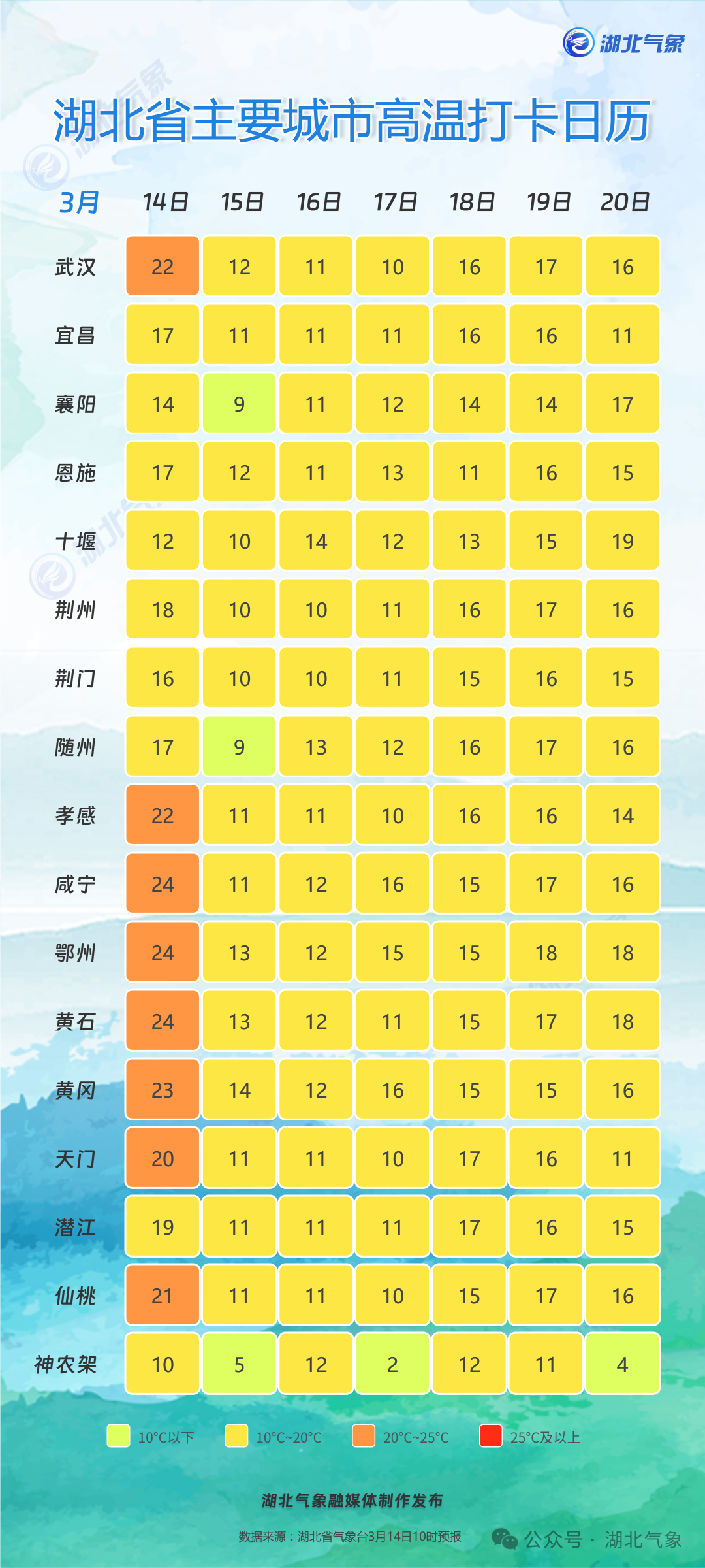 气温上,14日鄂西北地区最高气温率先降至13至18℃,其他地区19至24℃。15日最高气温鄂东南地区11至15℃,其他地区仅8至11℃,最低气温5至10℃。16日气温小幅度回升,全省最高气温10至15℃,最低气温6至10℃。