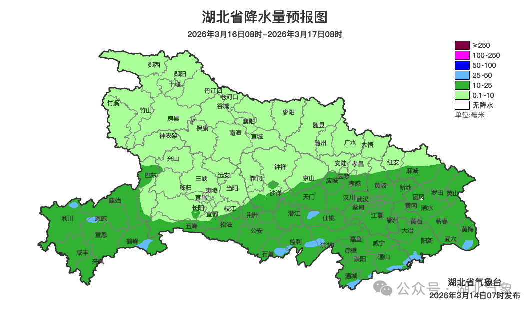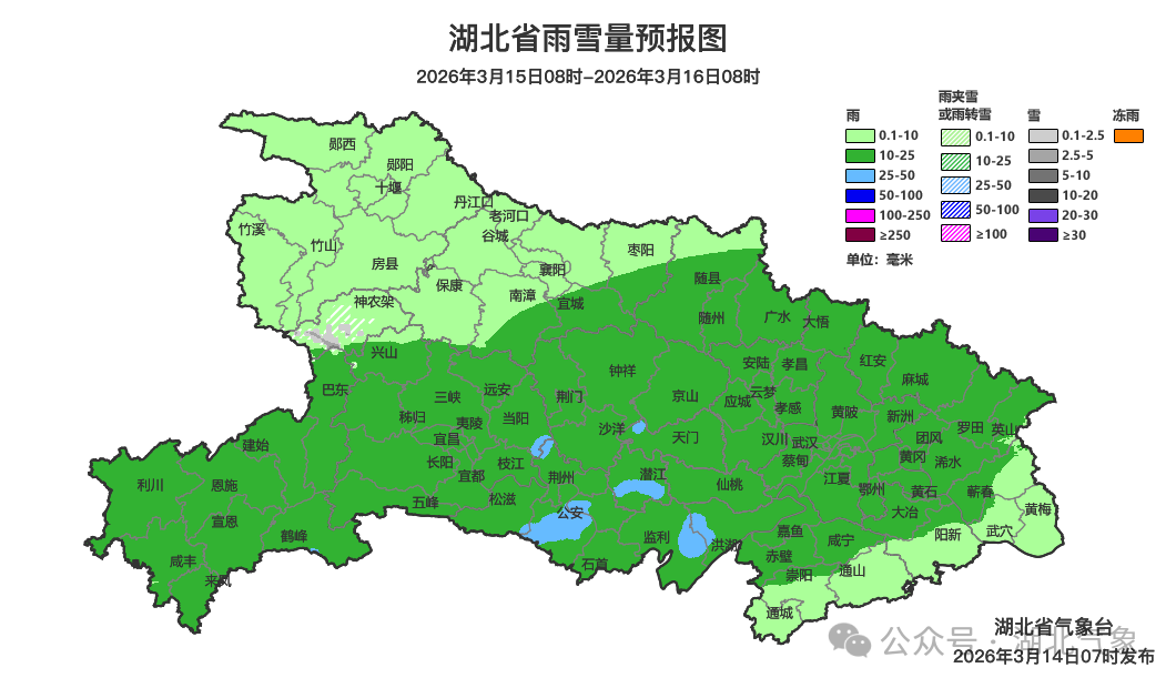 气象专家介绍,14日上午,中西部地区已被阴云覆盖,鄂西北、鄂西南等地阴天有小到中雨,局地大雨。鄂西北高海拔地区有雨夹雪或雪,其他地区白天暂以多云为主,夜间将转为小雨。15日鄂西北地区阴天有小雨,其中高海拔地区有雨夹雪或雪,其他地区阴天有小到中雨,局地大雨。16日鄂西北地区多云转小雨;其他地区阴天有小到中雨,局地大雨。