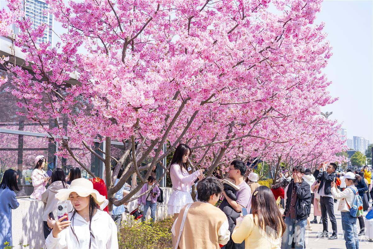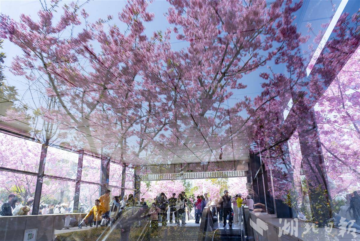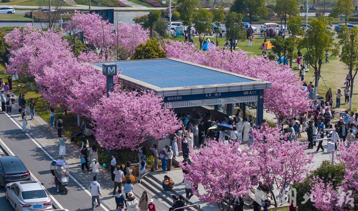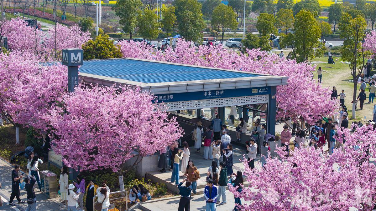 3月14日,武汉地铁11号线光谷未来三路站A出口,出站即遇樱花海,随手一拍,就是一张“春日明信片”。5年前,该地铁站A出口外的口袋公园建设启动,建设单位专门打造樱花主题,陆续栽植早中晚樱近130株,花期接续盛开蔚为壮观。随着武汉樱花季的到来,这里每天正上演着春日限定的粉色惊喜。不用特意寻找机位,只要一抬头,满树的樱花烂漫就把你包围。(湖北日报全媒记者 魏铼 通讯员 张璨龙 摄)