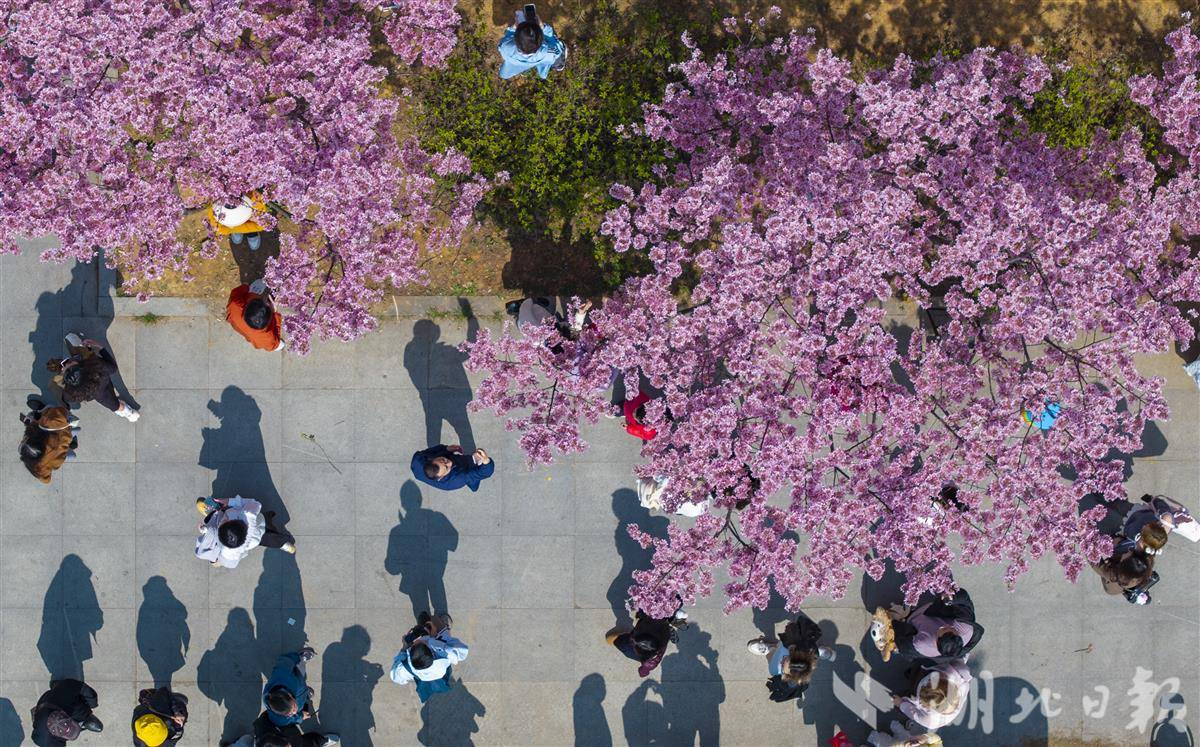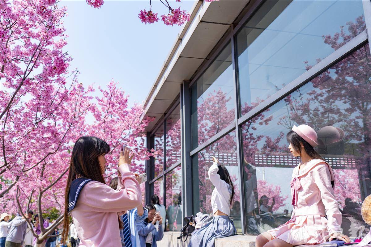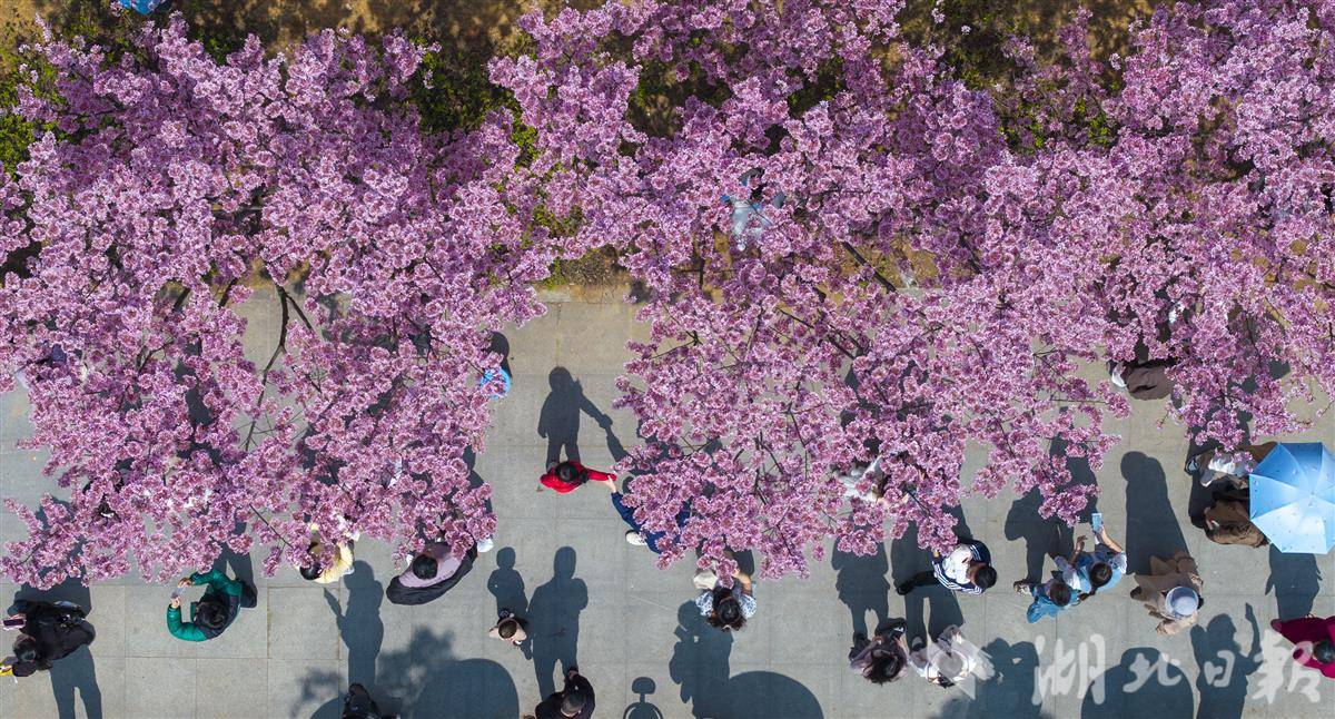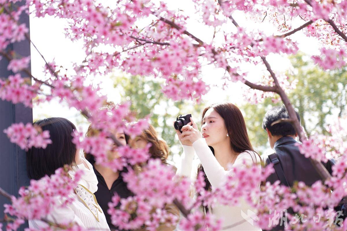 3月14日,武汉地铁11号线光谷未来三路站A出口,出站即遇樱花海,随手一拍,就是一张“春日明信片”。5年前,该地铁站A出口外的口袋公园建设启动,建设单位专门打造樱花主题,陆续栽植早中晚樱近130株,花期接续盛开蔚为壮观。随着武汉樱花季的到来,这里每天正上演着春日限定的粉色惊喜。不用特意寻找机位,只要一抬头,满树的樱花烂漫就把你包围。(湖北日报全媒记者 魏铼 通讯员 张璨龙 摄)