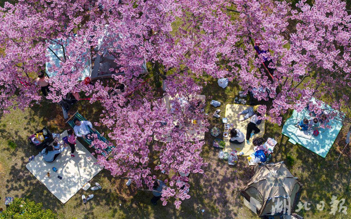武汉地铁11号线光谷未来三路站A出口附近,市民在樱花树下露营。