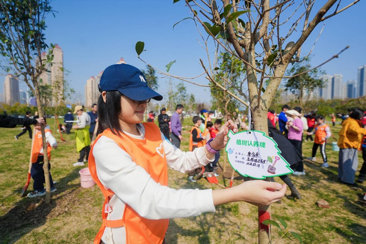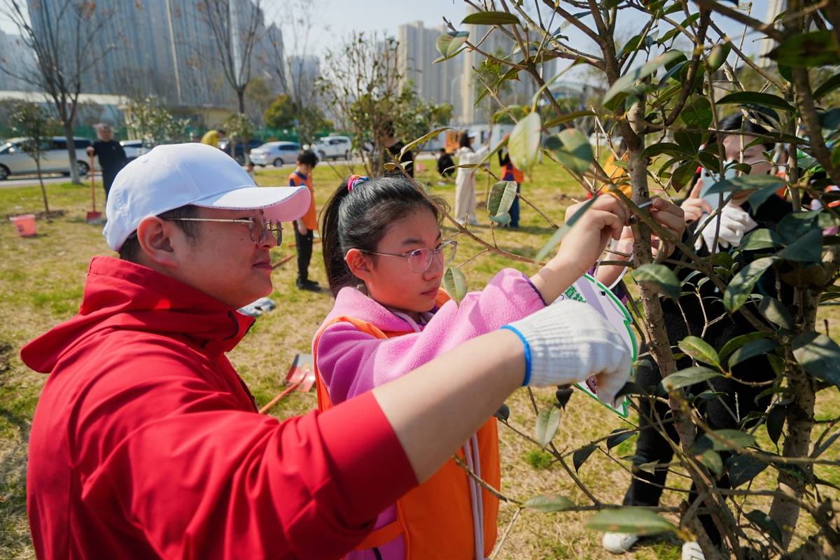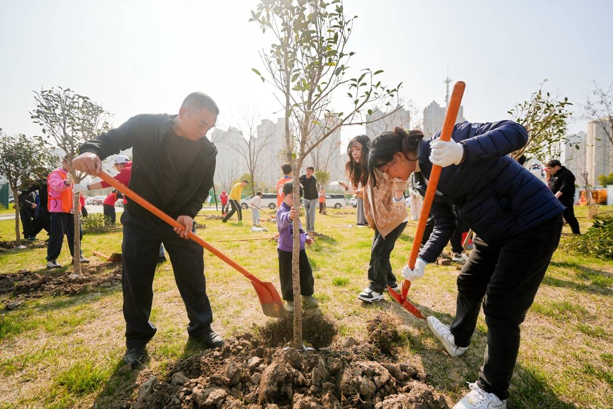 在植树护绿区域,省级“本禹志愿服务队”中建三局绿投公司绿水青山志愿服务队携手其他青年志愿者与“美丽小天使”亲子家庭分工协作、默契配合,挥锹铲土、扶苗填坑、浇水定根,共同种下一片“桂花林”。孩子们亲手栽种小树苗,在实践中体会植绿护绿的意义,用稚嫩的双手为城市增添一抹新绿,以实际行动践行绿色发展理念。