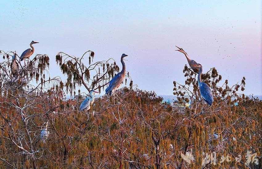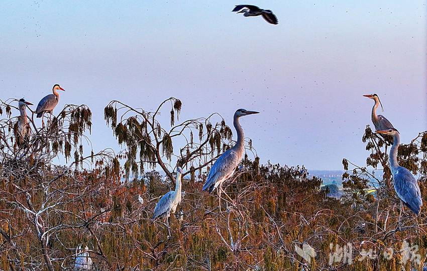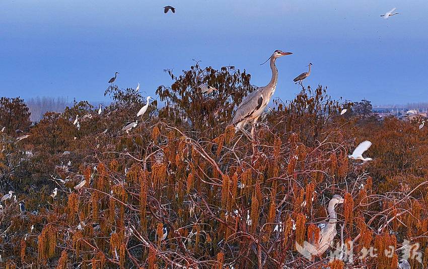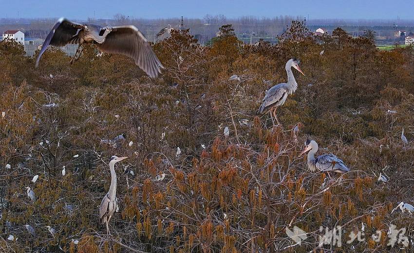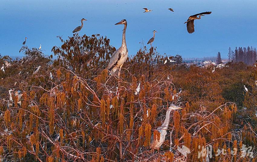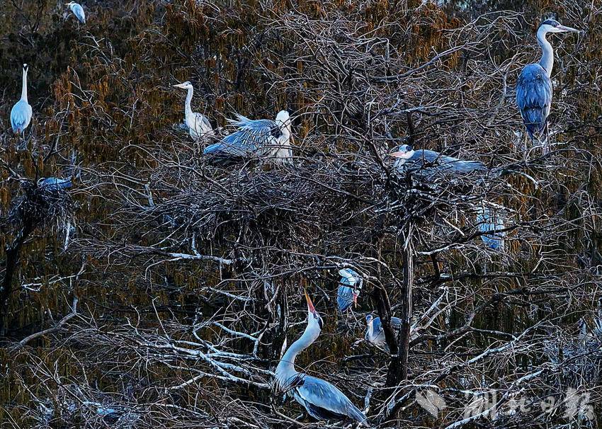 3月13日,许多鹭类安然地在涨渡湖湿地自然保护区的水上森林树枝上筑巢。