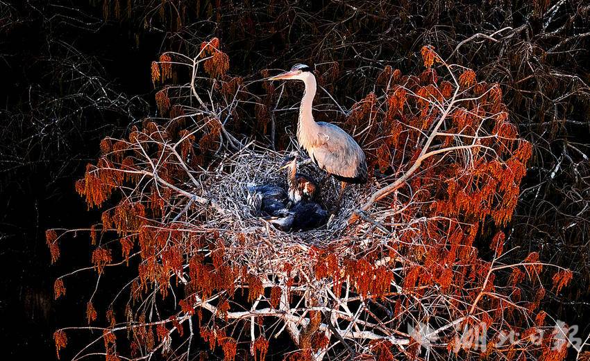 3月13日,涨渡湖湿地自然保护区的水上森林树枝上,刚刚出生不好久的苍鹭。