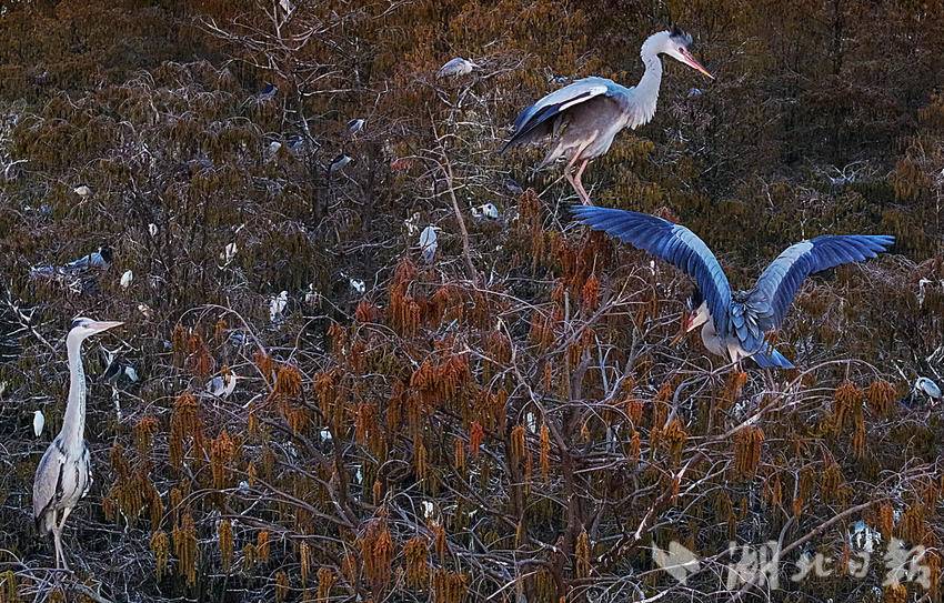 3月13日,白鹭、夜鹭、苍鹭等各种鹭鸟,在武汉新洲区涨渡湖湿地“水上森林”的池杉树林中的枝头筑巢繁殖后代。仲春时节,“水上森林”的鹭鸟集中进入孵化繁殖期,构成了一道优美的自然生态景观。(湖北日报全媒记者朱熙勇通讯员夏中凡摄)