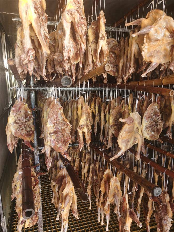 随后,完善保留纯手工腌制工艺。针对消费者反映的风干鸡肉过咸、烹制繁琐等问题,余沛带领技术人员不断调整配方,成功实现风干鸡低盐免泡。最大的突破,是攻克了“季节限制”。