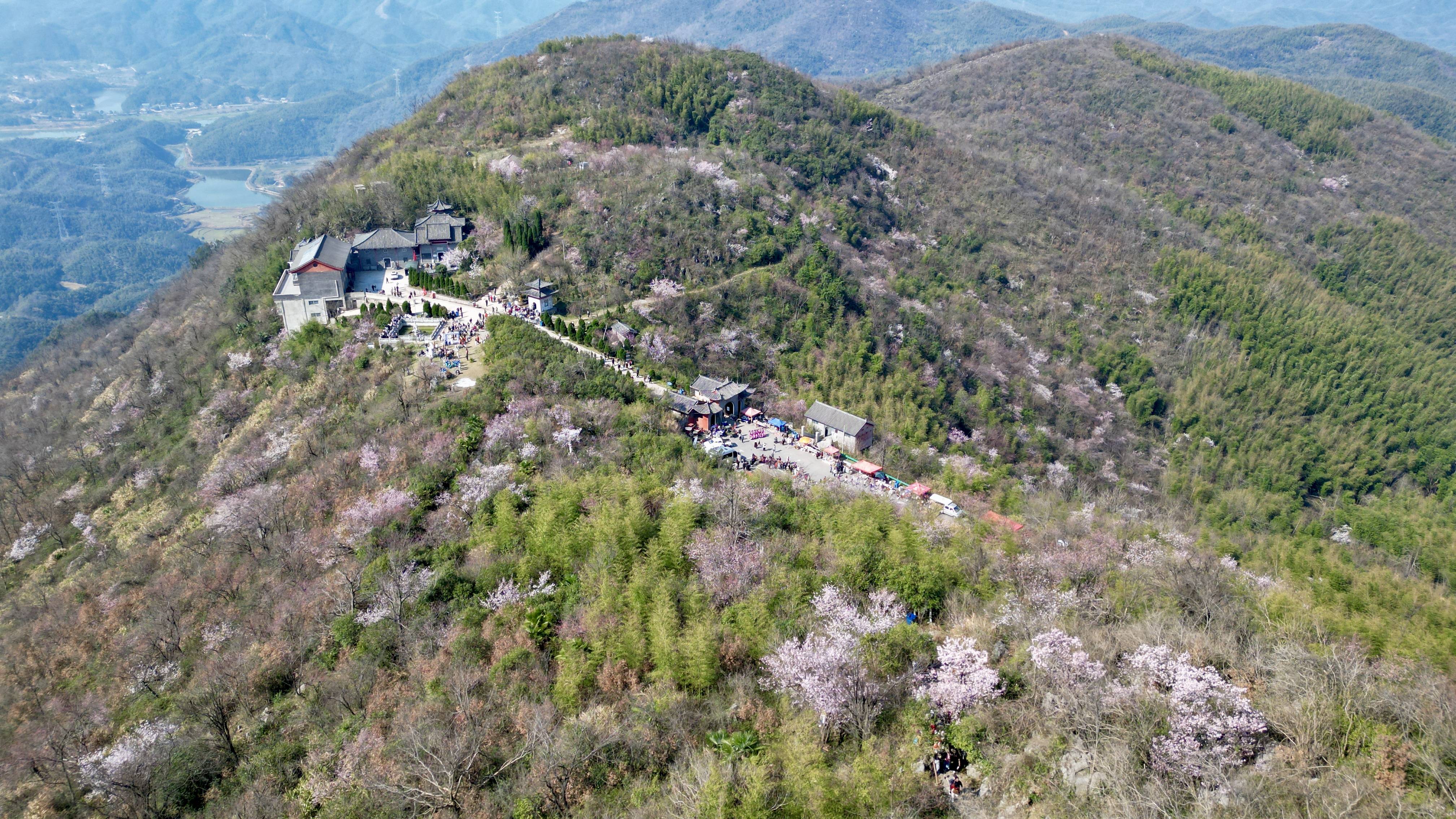 每年三月中旬,葛仙山野樱渐次开放,一簇簇樱花粉黛层叠、团团锦绣,白如雪、红似霞,连绵数十里的野樱与翠绿竹海交织成“叠翠流樱”奇景,构成一幅绝美春日水彩画。如诗如画的景致吸引八方游客,大家在山腰、山脊、山顶三大观景台解锁不同视角的樱海风光。