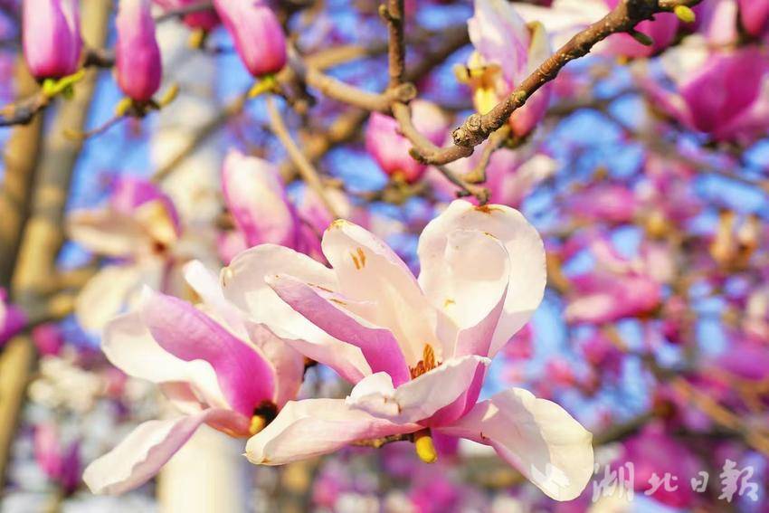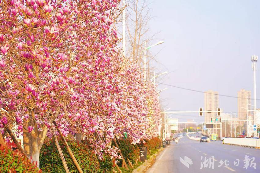 春归大地,万物复苏。连日来,随着气温稳步回升,武汉市新洲区新施公路新大桥至八屋村路段,2000余株玉兰树次第绽放,洁白似雪、粉紫如霞的花朵缀满枝头,成为春日里新洲最动人的风景线,吸引过往市民驻足观赏、拍照留念,为城市增添了浓厚的春韵气息。