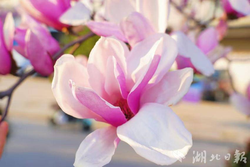 3月12日,记者在新施公路该路段看到,道路两侧的玉兰树舒展身姿,层层叠叠的花枝间,白玉兰、紫玉兰等品种竞相吐露芬芳。洁白的玉兰花晶莹素雅,花瓣厚润如精心雕琢的玉盏,盛着春日晨露,在暖阳下熠熠生辉,尽显高雅圣洁;粉紫色的玉兰则娇羞温婉,似少女晕染的面颊,随风轻摇,别有一番韵味。微风吹过,花枝摇曳,花瓣簌簌飘落,宛若一场浪漫的花雨,淡淡的清香弥漫在空气中,令人心旷神怡,也吸引着蜜蜂在花丛间忙碌穿梭,勾勒出一幅生机盎然的春日画卷。